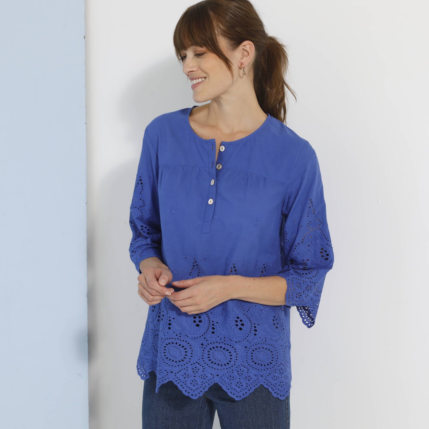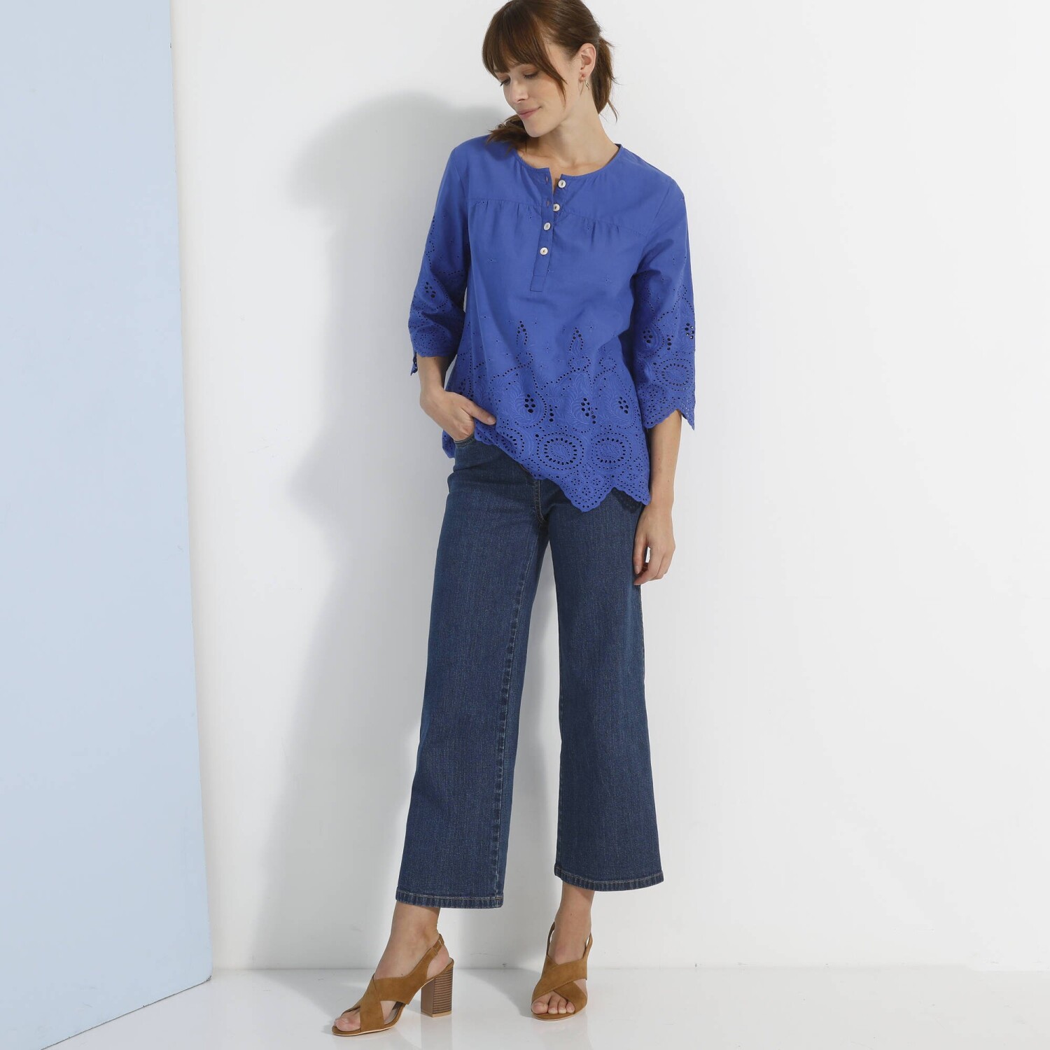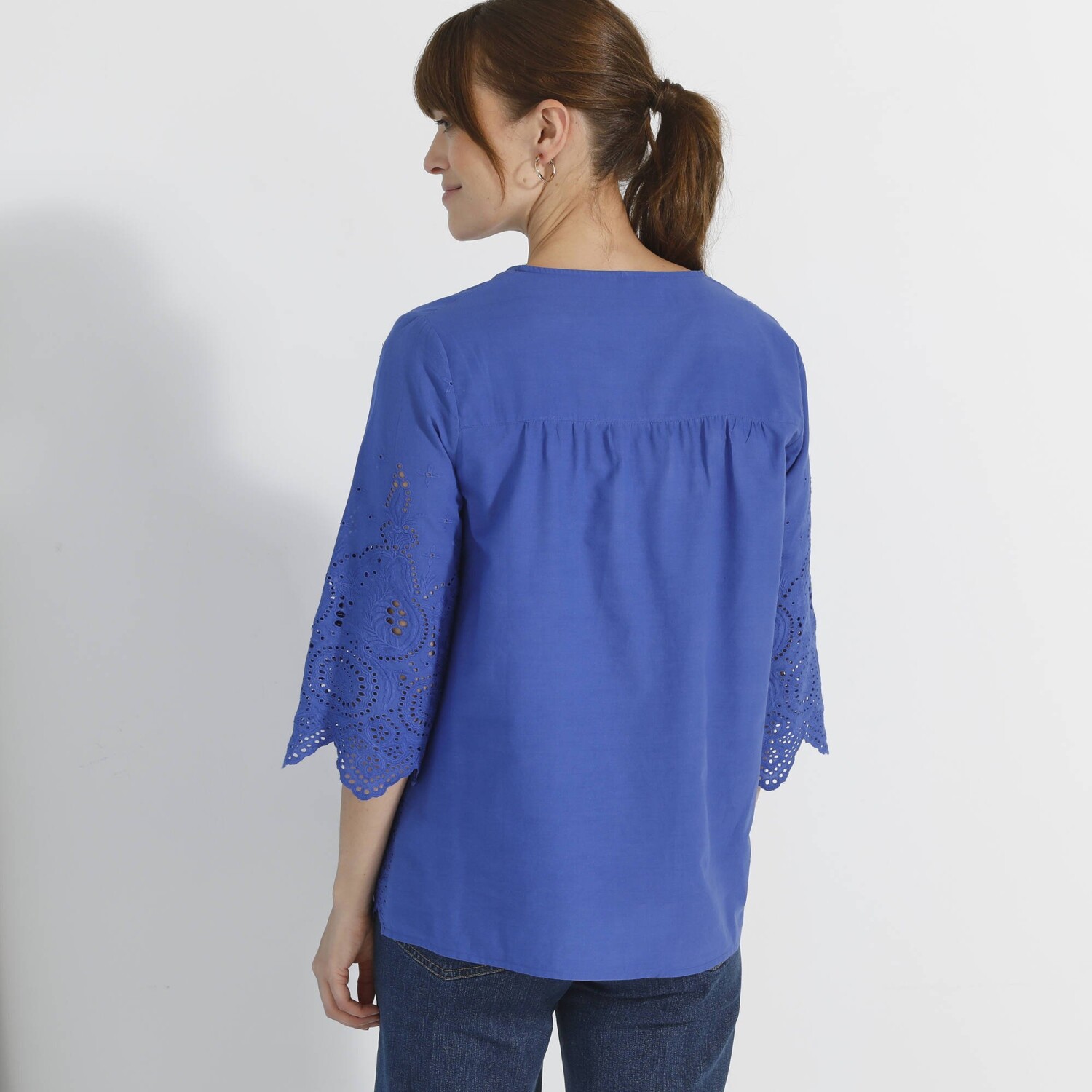 Maxi print, delikatne detale i zwiewny krój – ta bluzka jest idealna! Stójka z zakładkami. Dekolt w serek z przodu. Długie, szerokie rękawy z gumką na końcach. Zakładki na ramionach. Prosty dół. Można prać w pralce.