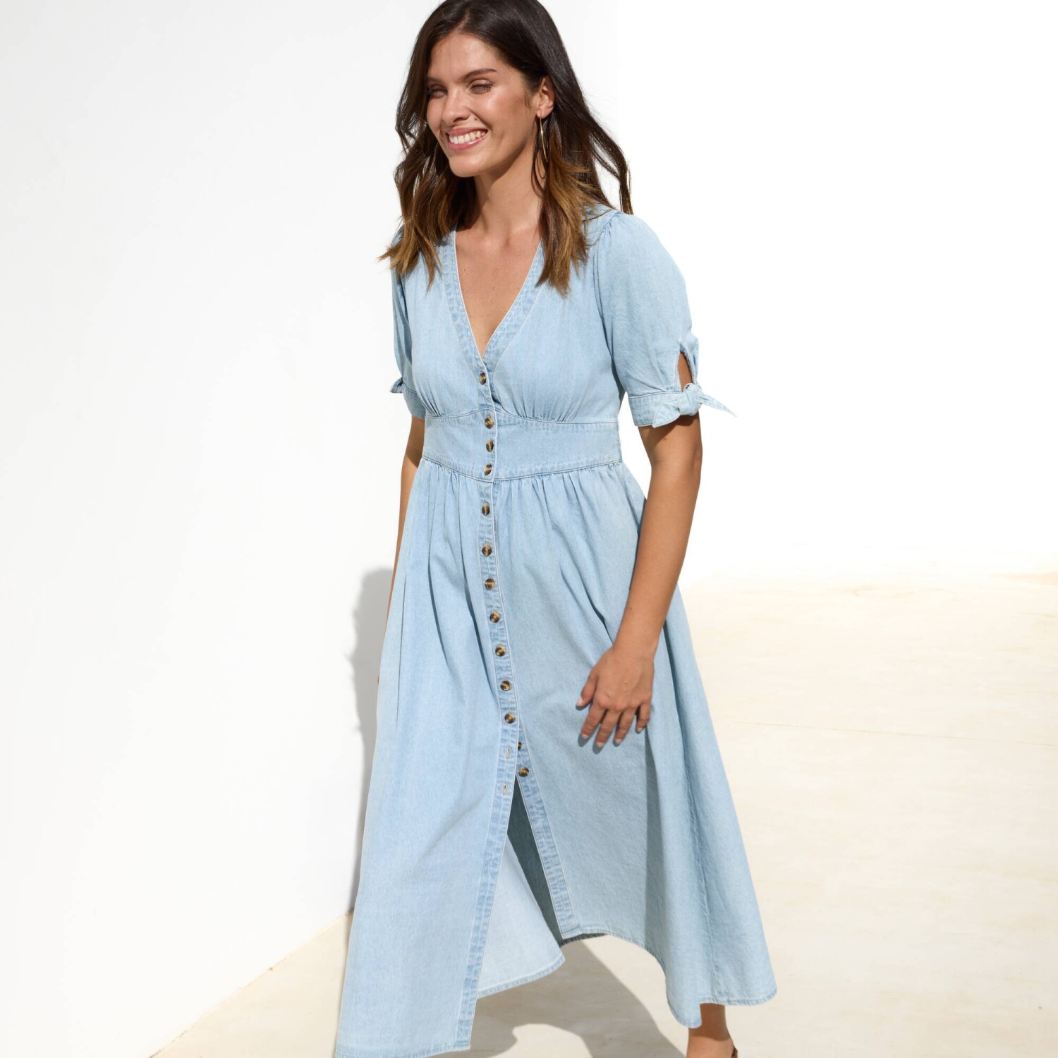 Rozkloszowana sukienka jeansowa idealnie nadaje się na co dzień i na różne okazje. Prosty krój. Stójka z dekoltem w serek zapinanym z przodu na guziki. Marszczenia z przodu i z tyłu pod dekoltem oraz u góry rękawów. Długie rękawy, ściągacze u dołu. Posiada certyfikat „Made in Green” OEKO-TEX. Oprócz weryfikacji kilkuset substancji chemicznych, które przyczyniają się do wysokiego poziomu bezpieczeństwa, etykieta ta gwarantuje przemyślane zasady produkcji i kontrolowane praktyki społeczne. Można prać w pralce.