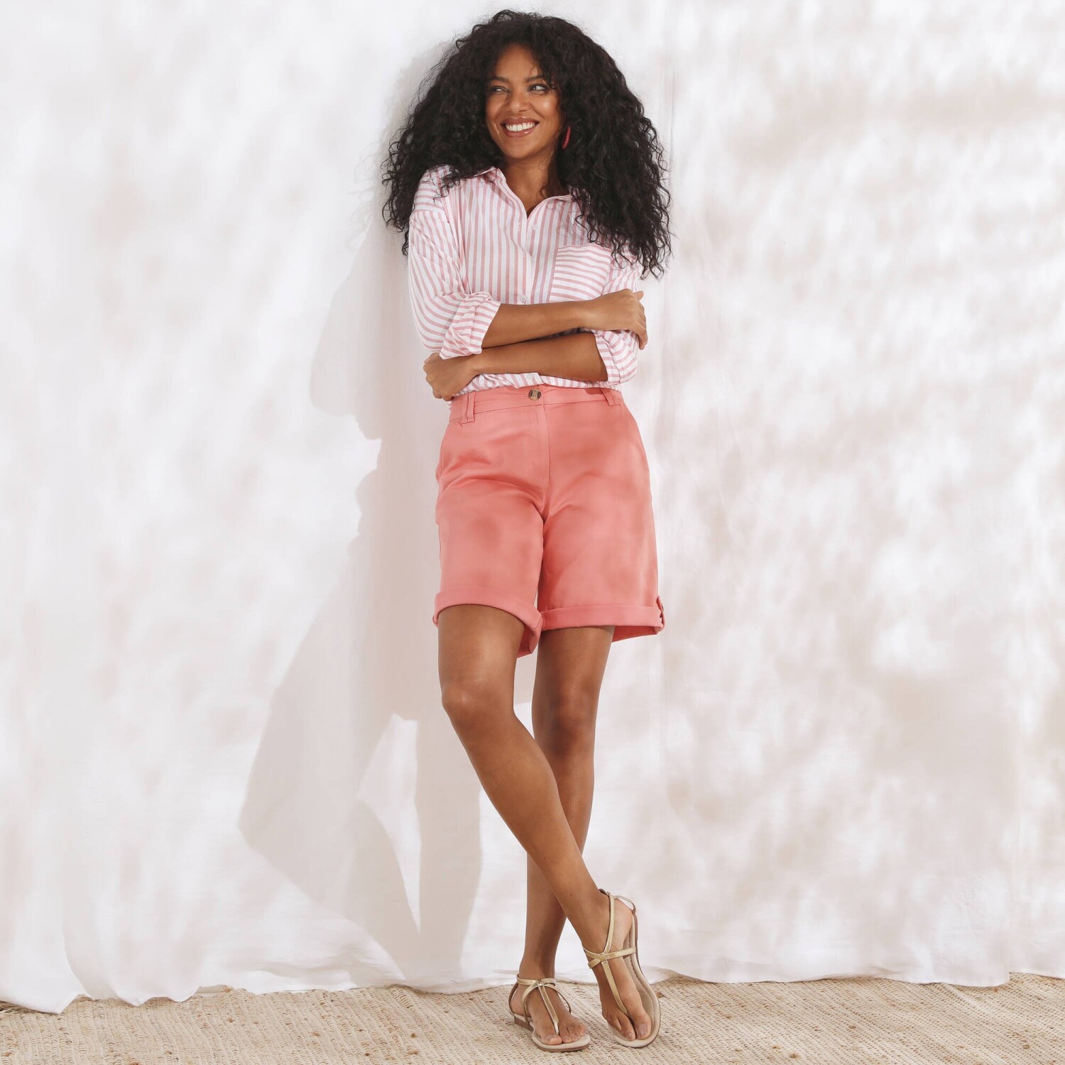 Odsłoń nogi w bermudach o regulowanej długości! Wykonane z miękkiej w dotyku elastycznej bawełny bermudy w mgnieniu oka zmieniają się w szorty. Zapięcie na zamek błyskawiczny i guzik. Regularna wysokość talii. Wyprofilowany pas ze szlufkami, gumka z tyłu od rozmiaru 44. 2 kieszenie ze ściągaczem. 2 kieszenie ze ściągaczem zapinane na guziki + 2 naszywane kieszenie z tyłu zapinane na guziki. Nogawki zakończone patkami zapinanymi na guziki. Standard 100 według Oeko-Tex (CQ 1216/3 IFTH). Znak ten oznacza produkty tekstylne, które zostały poddane testom laboratoryjnym na obecność szerokiej gamy szkodliwych substancji, a produkt jest bezpieczny w stopniu przekraczającym obowiązujące normy. Można prać w pralce.