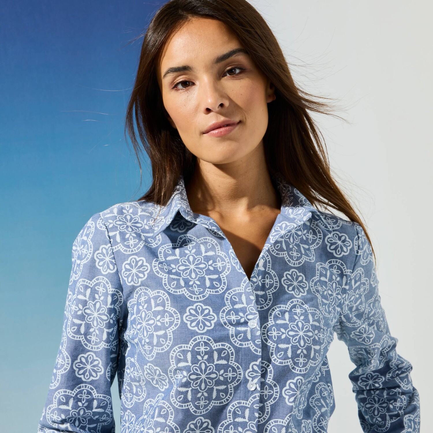 Jaki jest świetny sposób na rozpoczęcie sezonu wiosennego? Oczywiście w koszuli chambray z nadrukiem! Kołnierzyk koszuli. Zaszewki na piersi. Tylna talia i rozcięcia na ramionach. Długie rękawy. Mankiety zapinane na guziki. Zaokrąglony dół. Można prać w pralce.