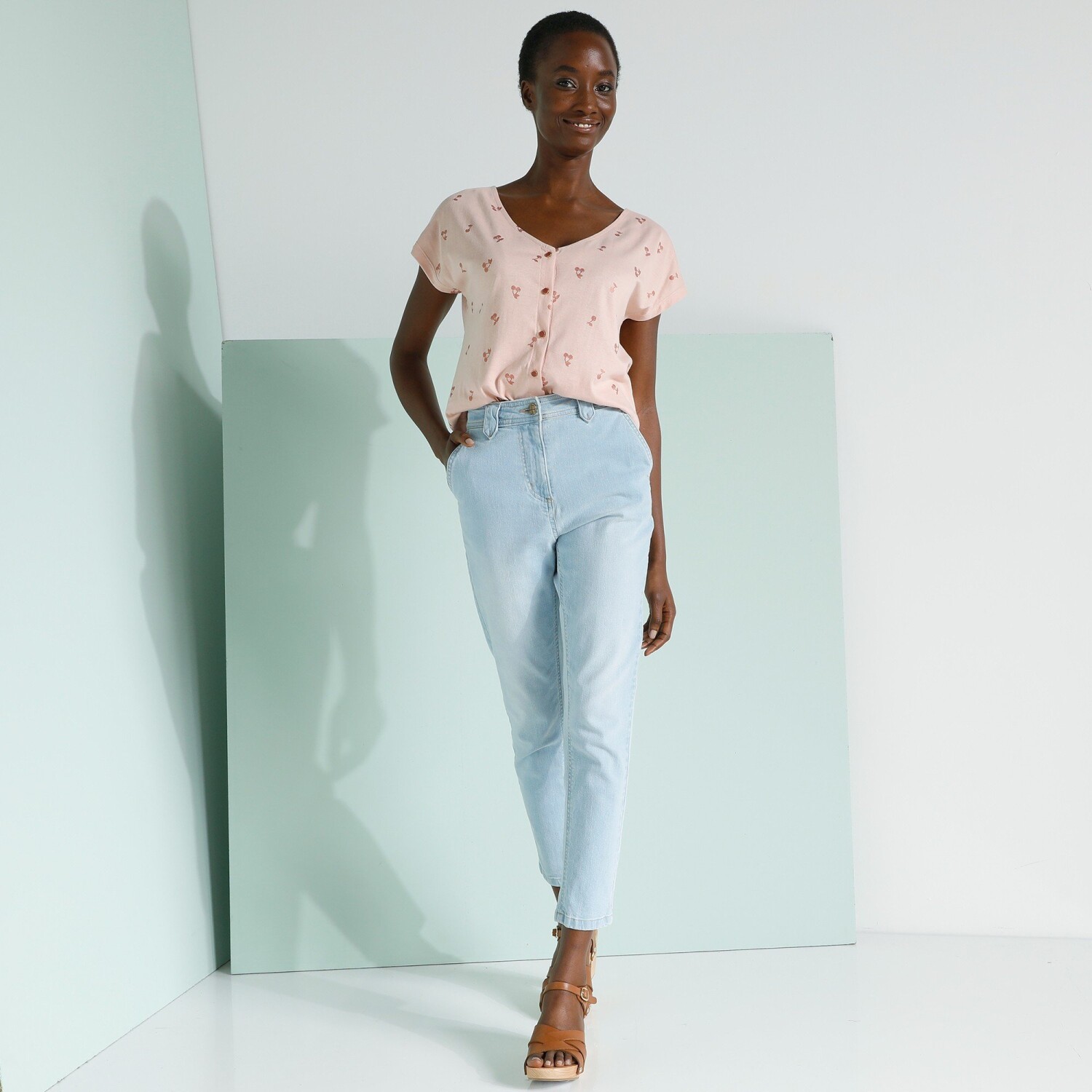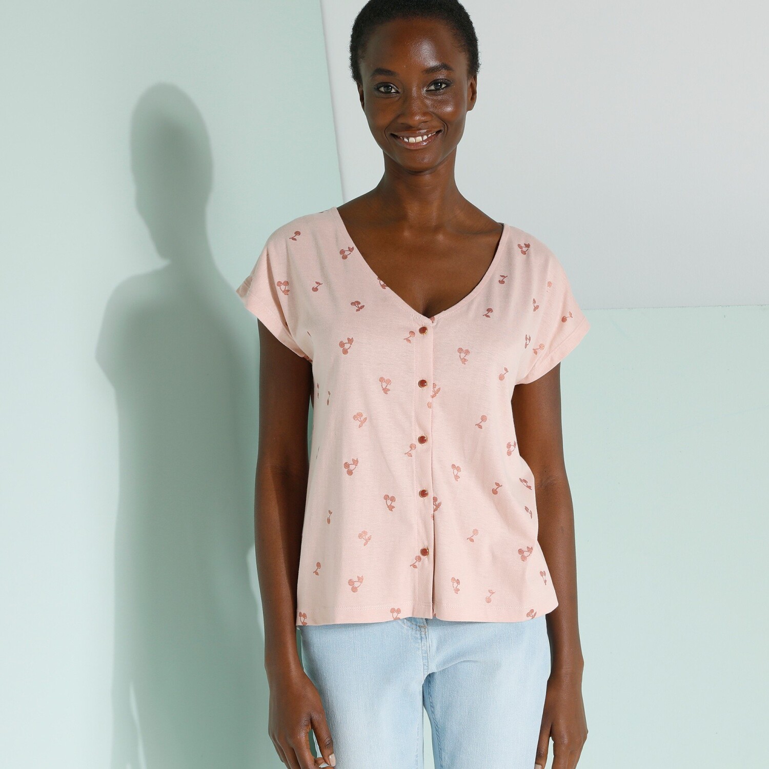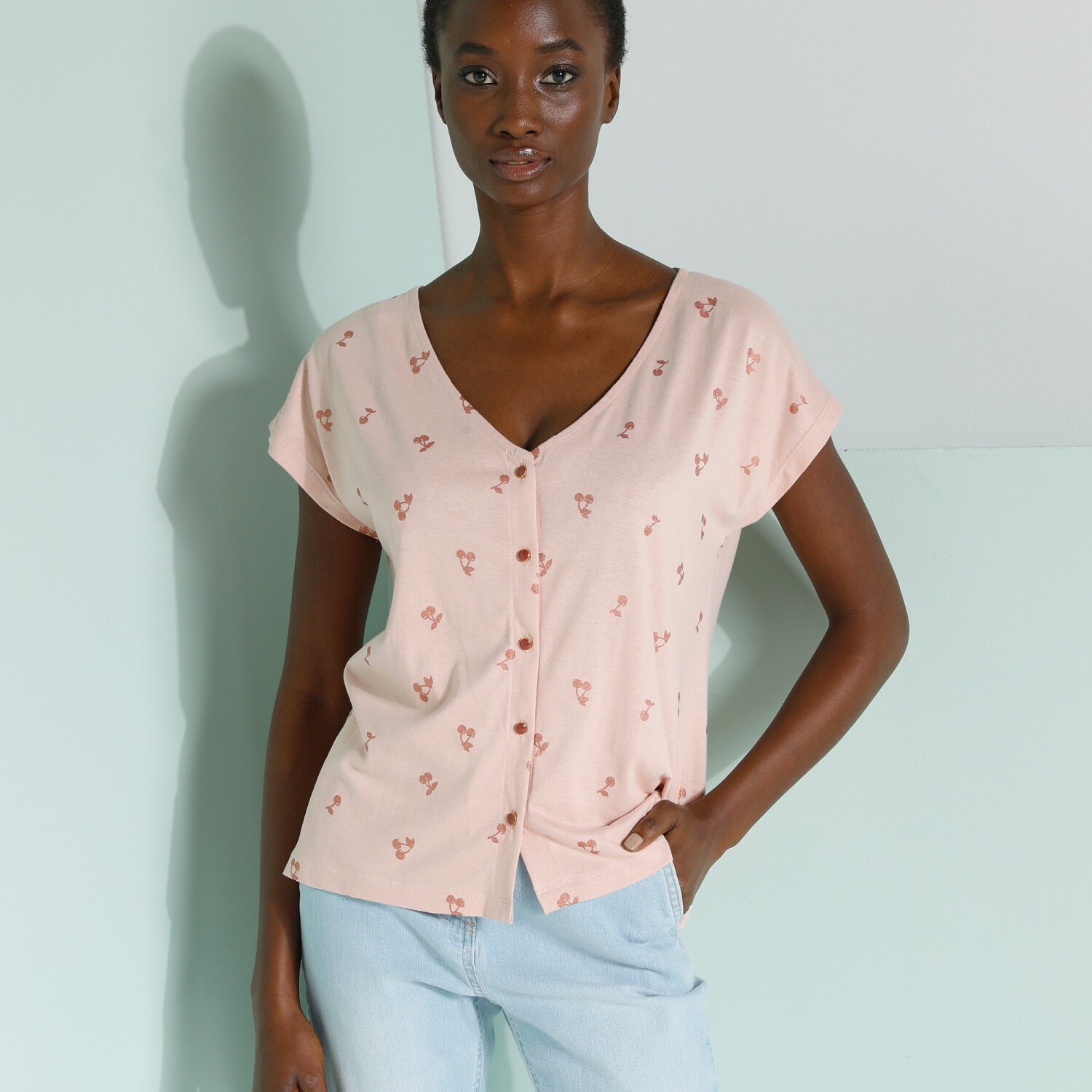 Koszula zapinana na guziki z dekoltem w szpic z nadrukiem wiśni