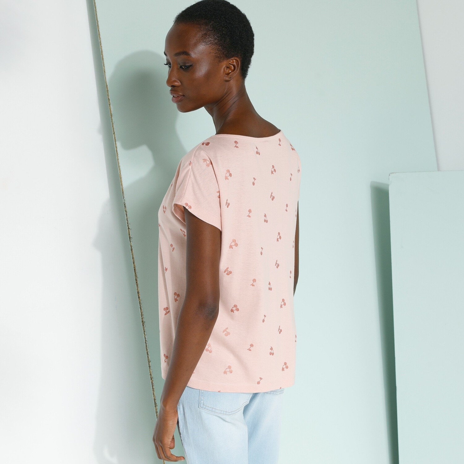 Dla miłośniczek mody retro koszulka z nadrukiem złotej wiśni. Dekolt w szpic. Złoty wiśniowy nadruk. Pełny przód. Krótkie rękawy, opadające ramiona. Prosty dół. Można prać w pralce.