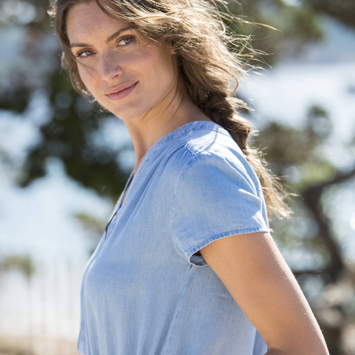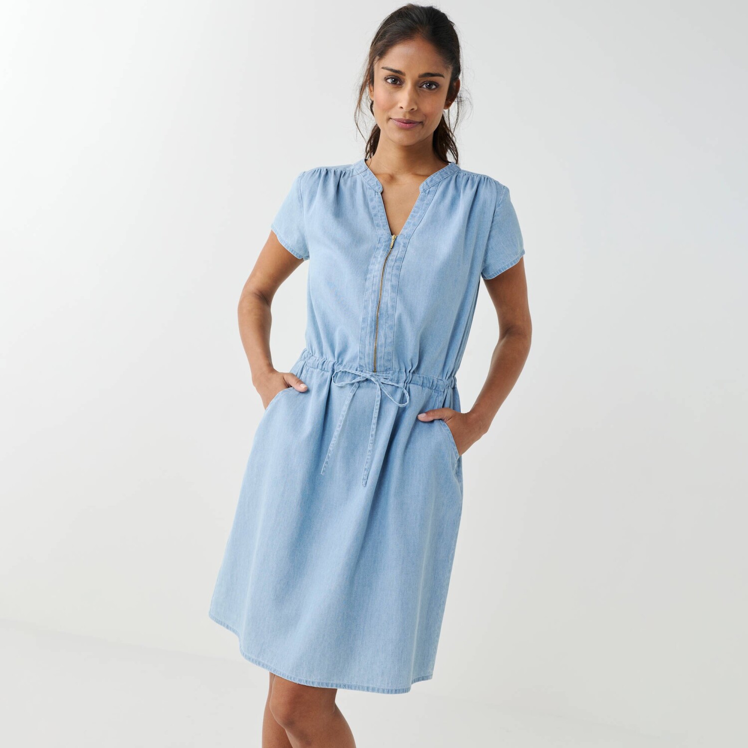 Marzysz o eleganckiej sukience, która będzie odpowiednia na różne okazje? W takim razie wybierz jeansową krótką sukienkę z suwakiem przy dekolcie. Wykonana z lekkiego denimu. Długość przed kolano. Okrągły dekolt z rozporkiem do pasa. Krótkie rękawy. Wcięcie w talii i sznurek do ściągania. 2 kieszenie z przodu. Lekko rozszerzany dół. Oddychający materiał, idealne dopasowanie. Standard 100 według Oeko-Tex (CQ 1216 / 3 IFTH). Ten znak identyfikuje produkty tekstylne, które zostały poddane testom laboratoryjnym pod kątem szerokiej gamy szkodliwych substancji, a produkt jest bezpieczny poza obowiązującymi normami. Można prać w pralce.