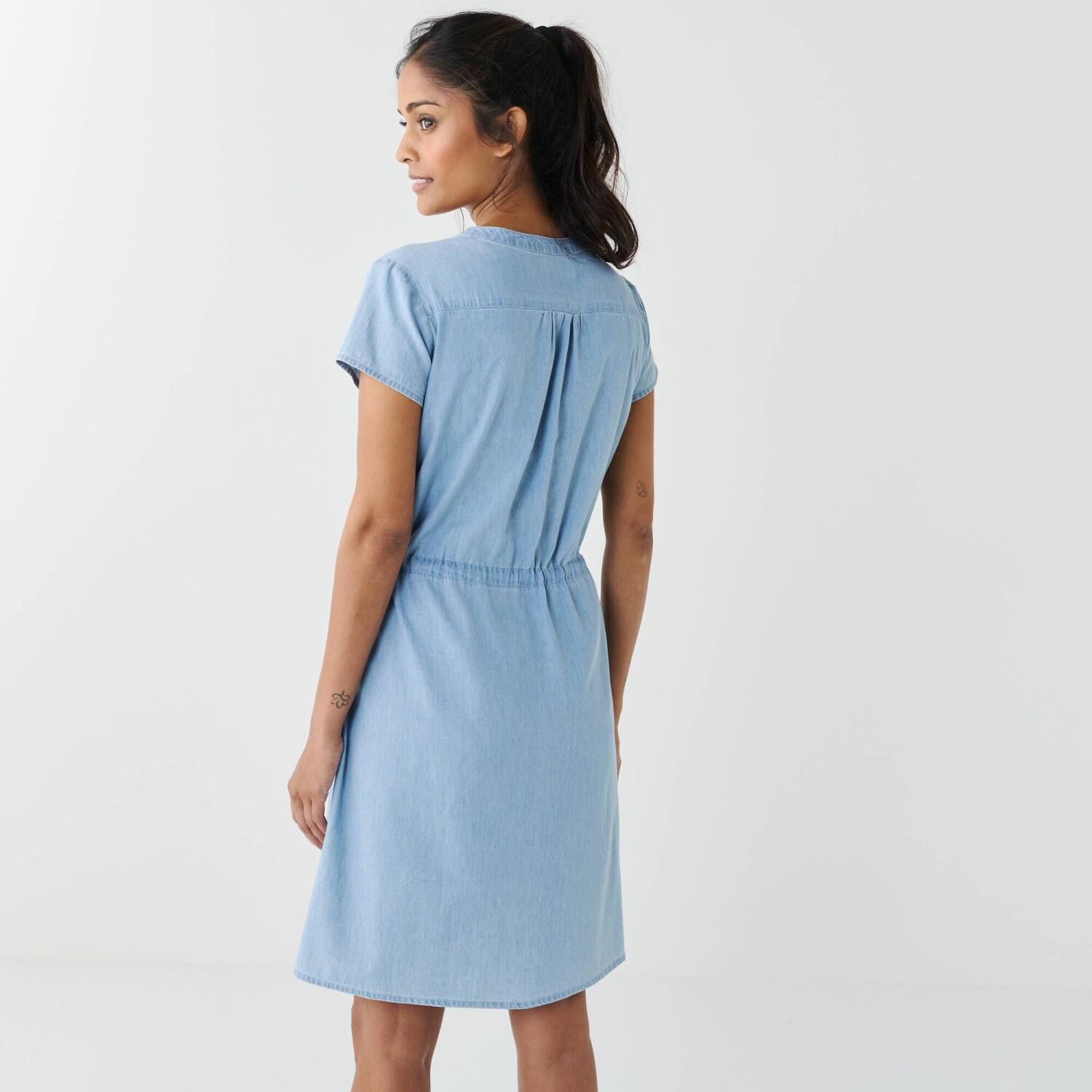 Krótka sukienka z zapinanym dekoltem i krótkimi rękawami, wykonana z jasnego dżinsu