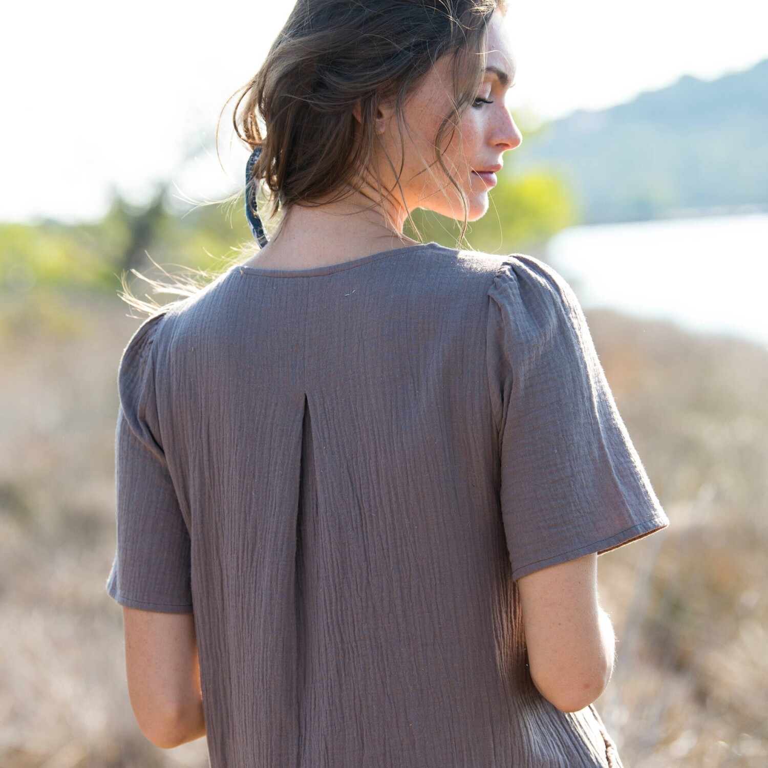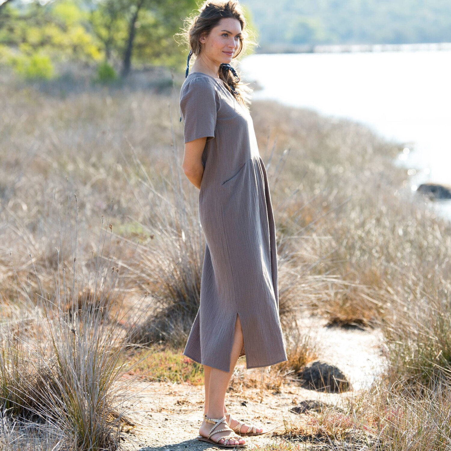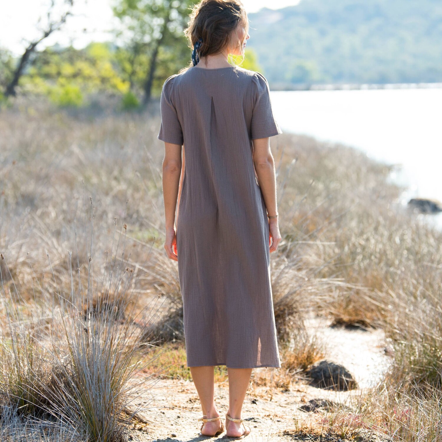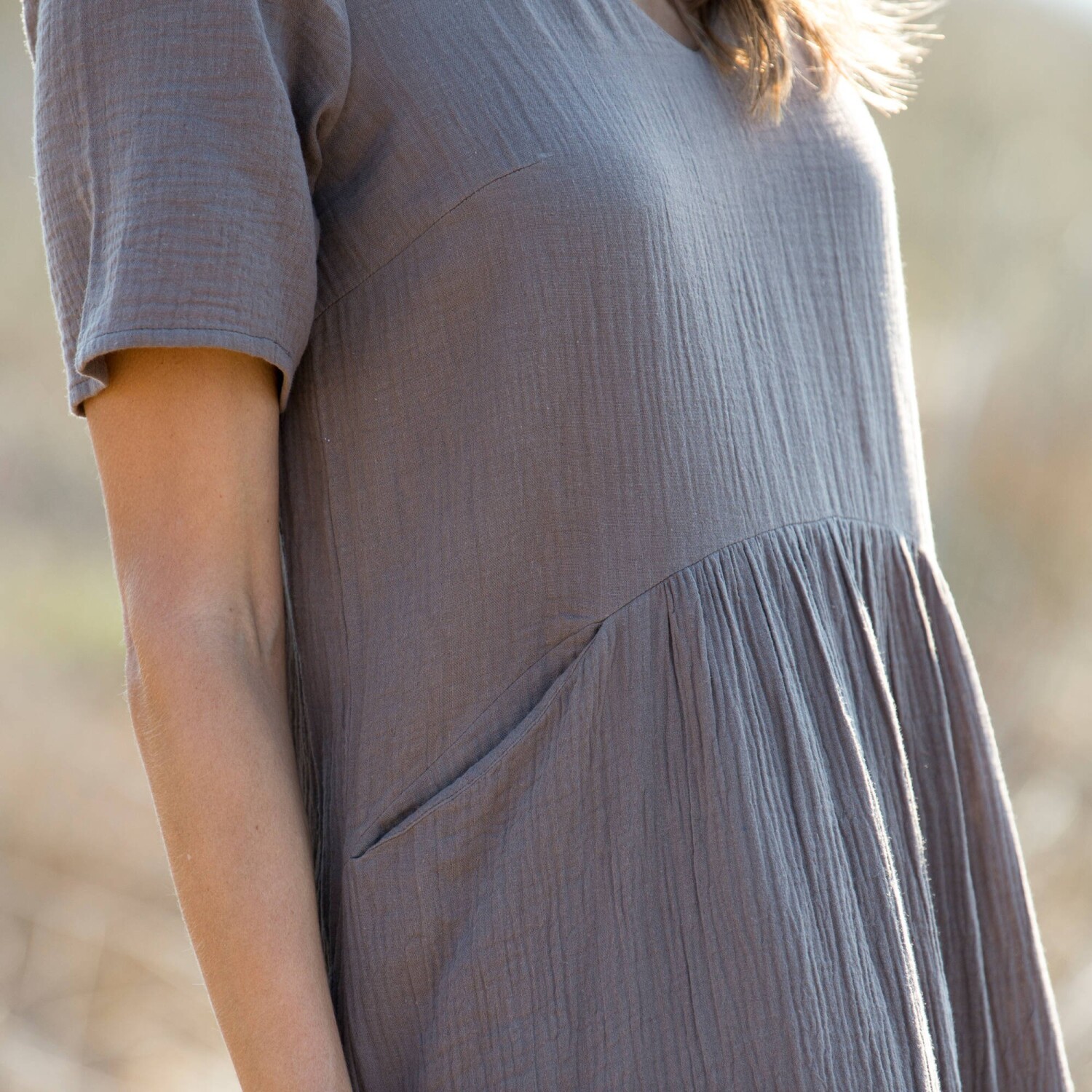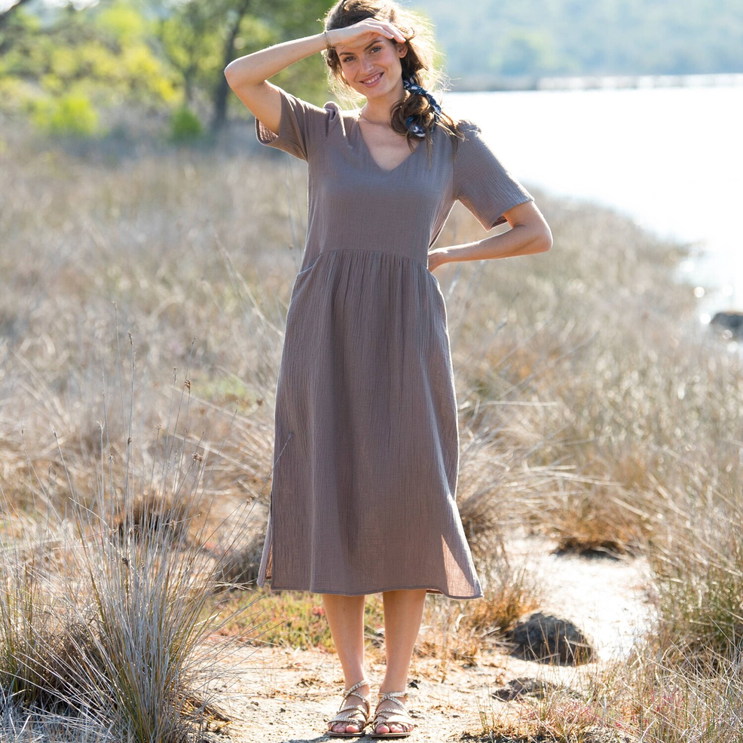 Letnia sukienka z bawełnianego muślinu, wykonana z doskonałego materiału o marszczonym wyglądzie. Dekolt V. Rękawy do łokcia. Marszczenia na ramionach. Rozcięcie i marszczenie z przodu pod biustem. Zaokrąglone rozcięcie z przodu + kieszenie boczne. Rozkloszowany dół, boczne rozcięcia. Tylne magazyny. Standard 100 według Oeko-Tex (CQ 1216 / 3 IFTH). Ten znak identyfikuje produkty tekstylne, które zostały poddane testom laboratoryjnym pod kątem szerokiej gamy szkodliwych substancji, a produkt jest bezpieczny ponad obowiązujące normy. Można prać w pralce.