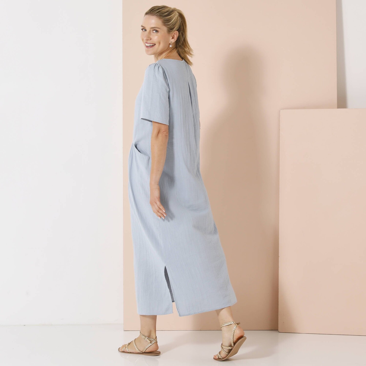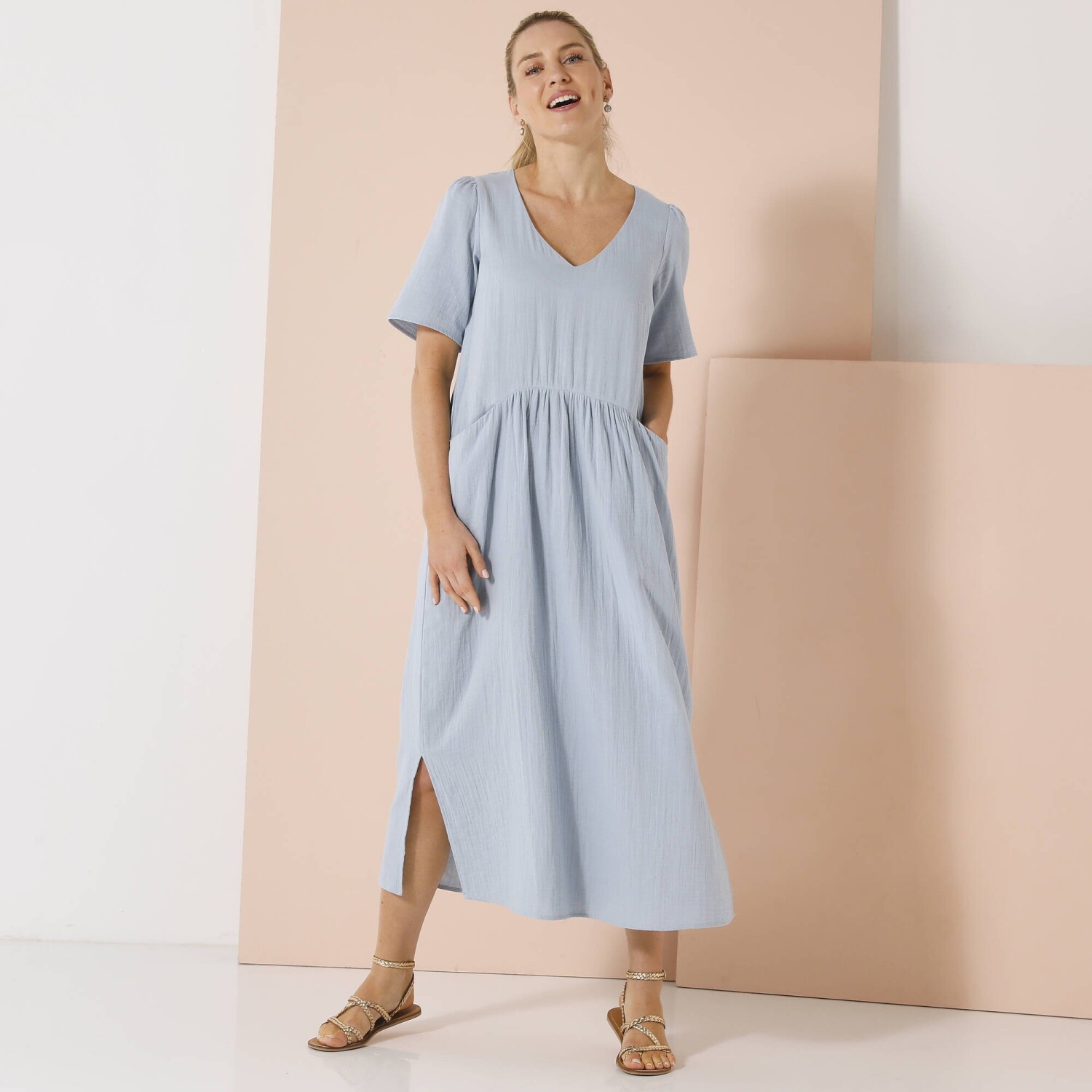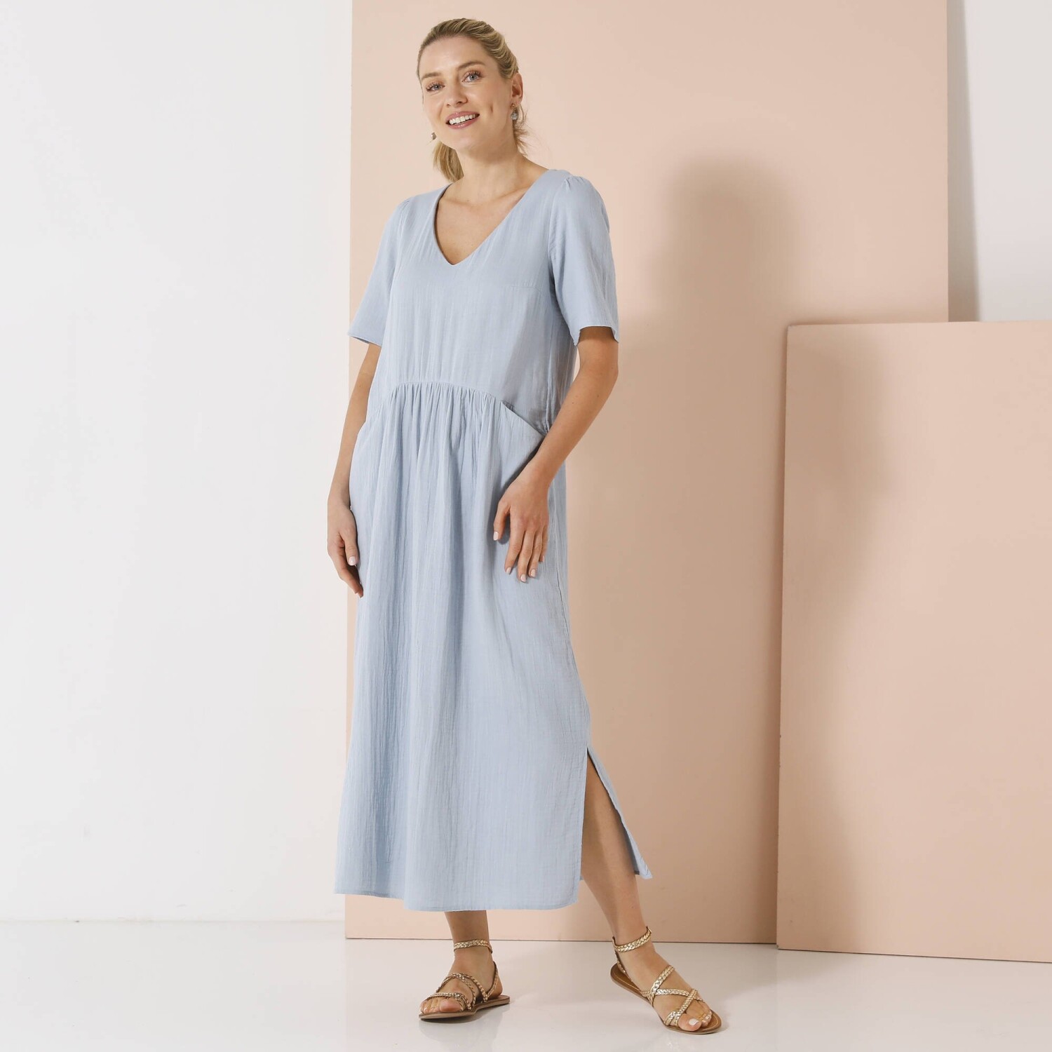 Lekka, efektowna i wygodna, to letnia sukienka par excellence. Dekolt w szpic. Bez rękawów. 3 falbany poniżej talii. Można prać w pralce.