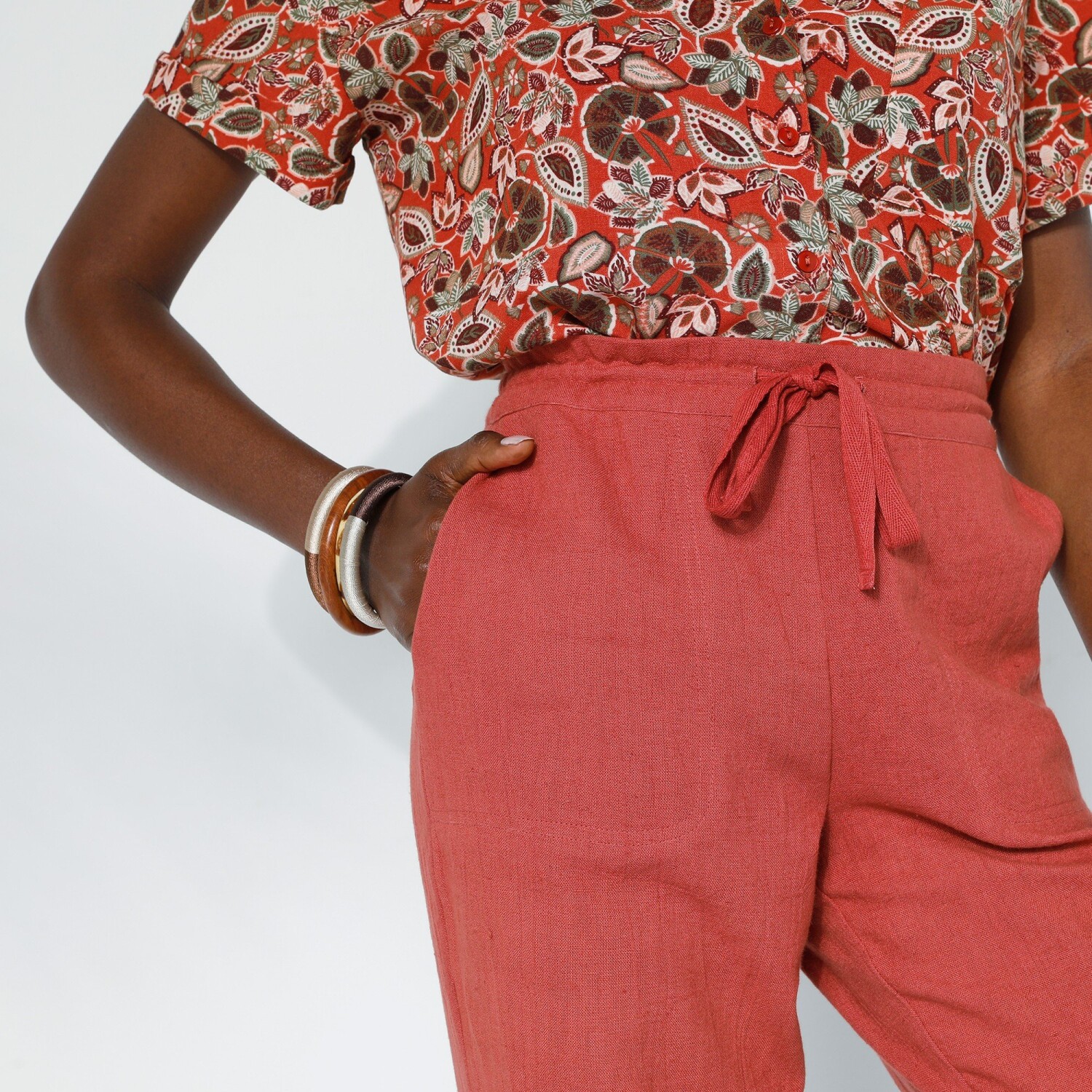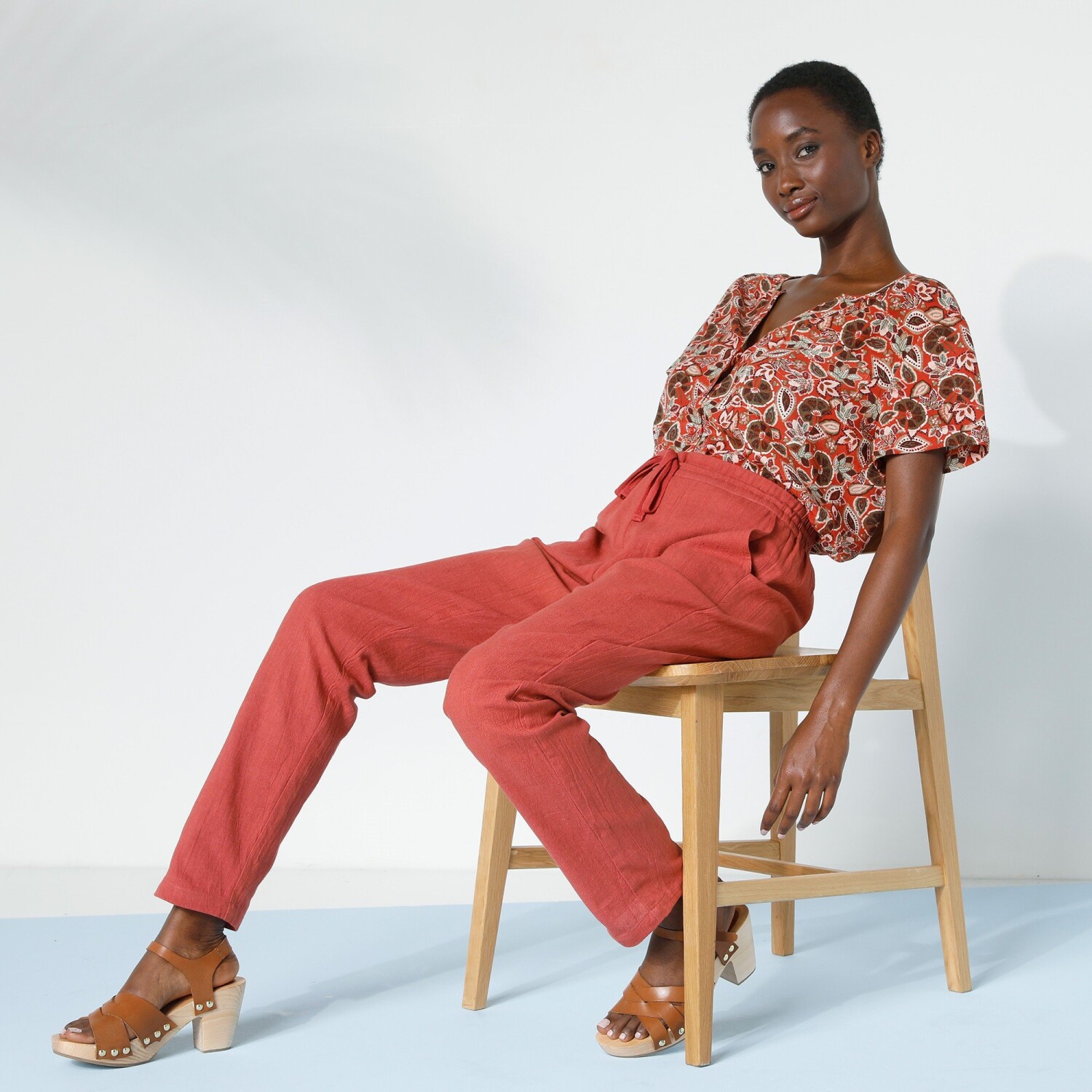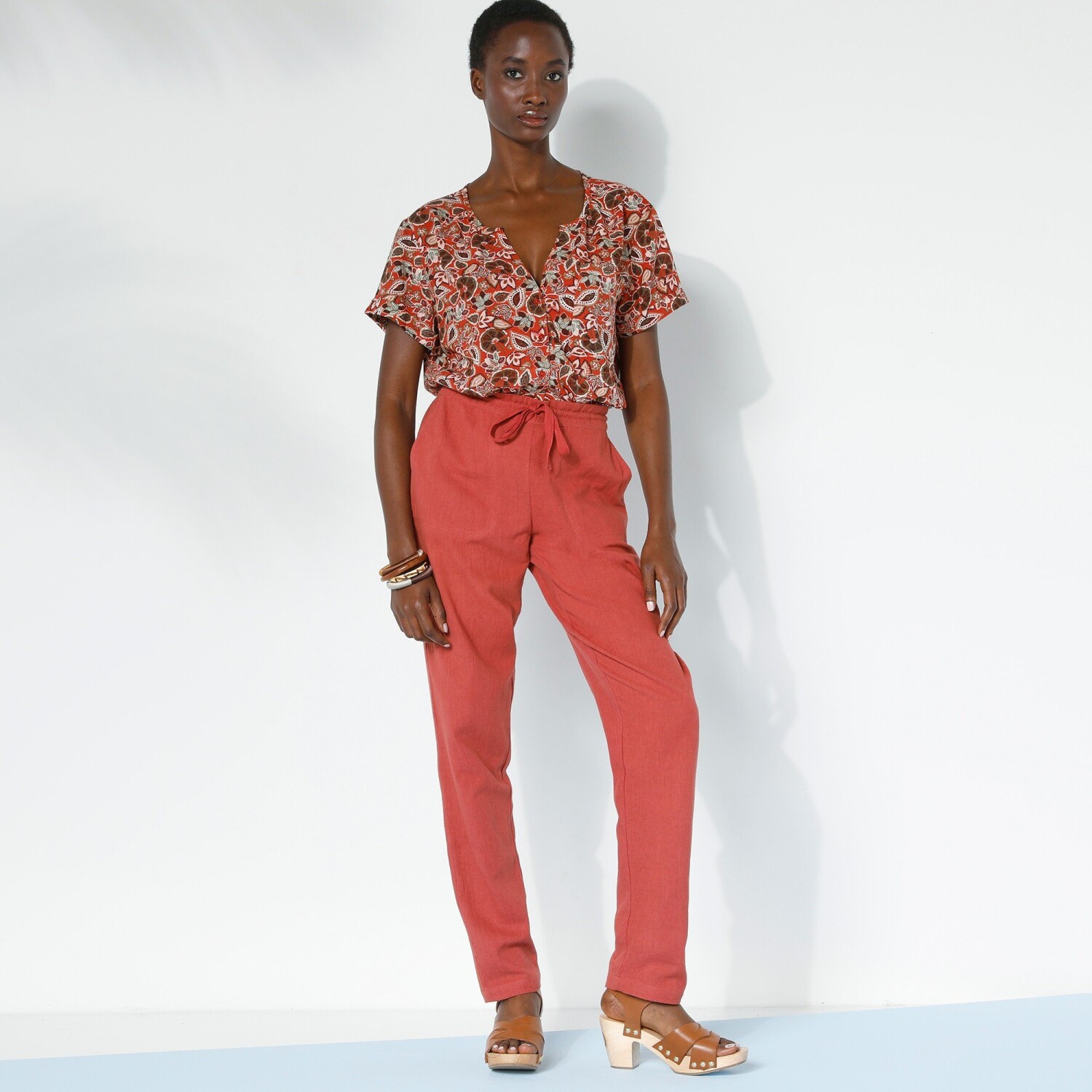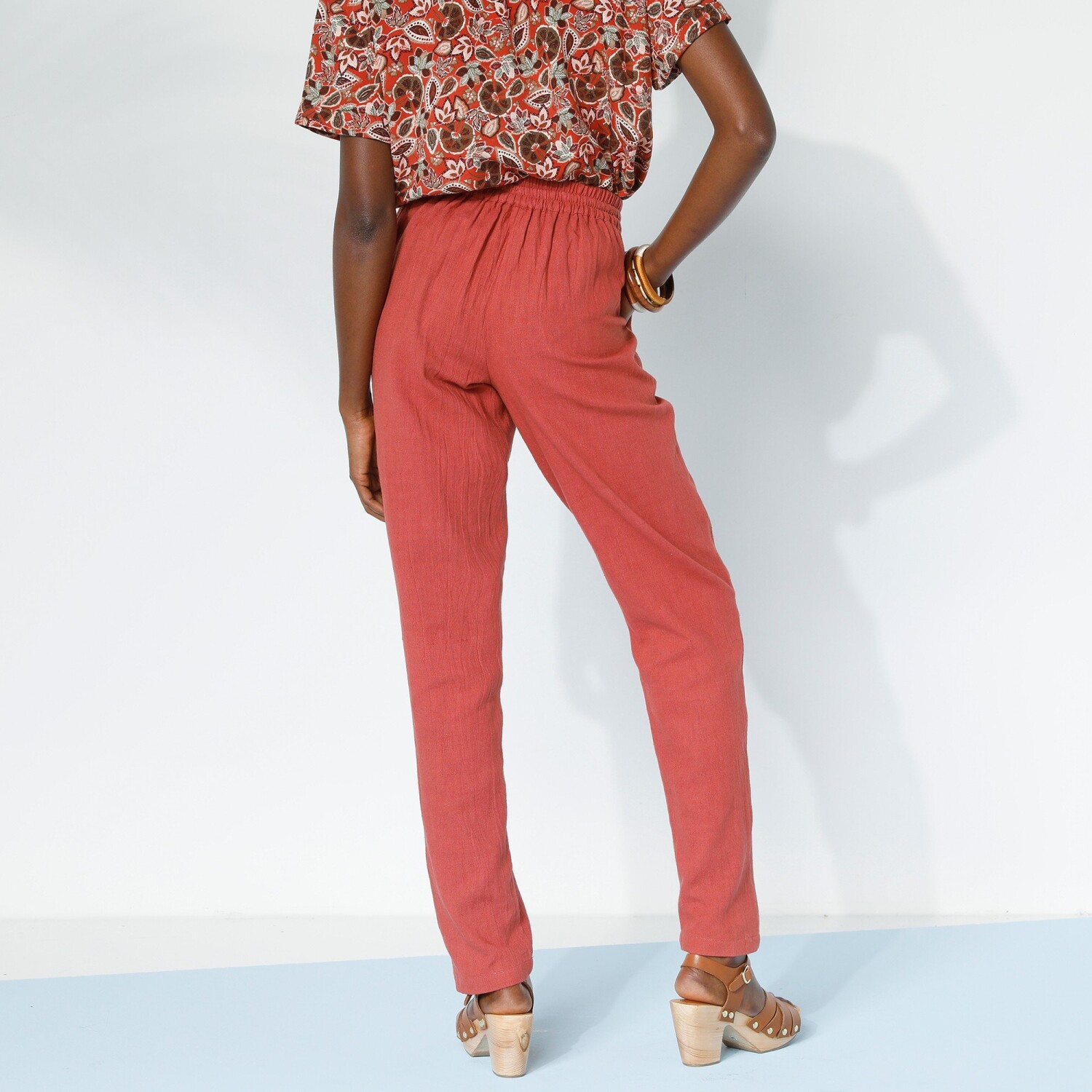 Proste, przewiewne spodnie z mieszanki bawełny i lnu w sam raz na lato. Regularna wysokość talii. Wąski, przewiewny krój. Szeroki pas z kokardą, elastyczny z tyłu. Mieszanka lnu i bawełny. Przednie kieszenie ze ściągaczem. Można prać w pralce.