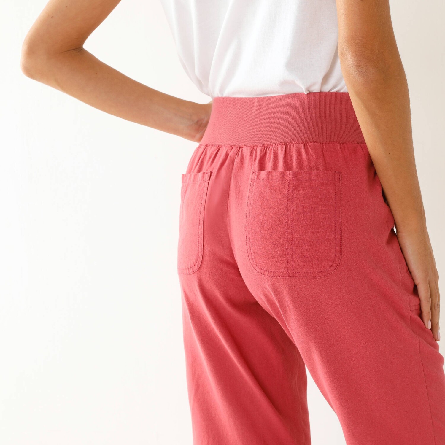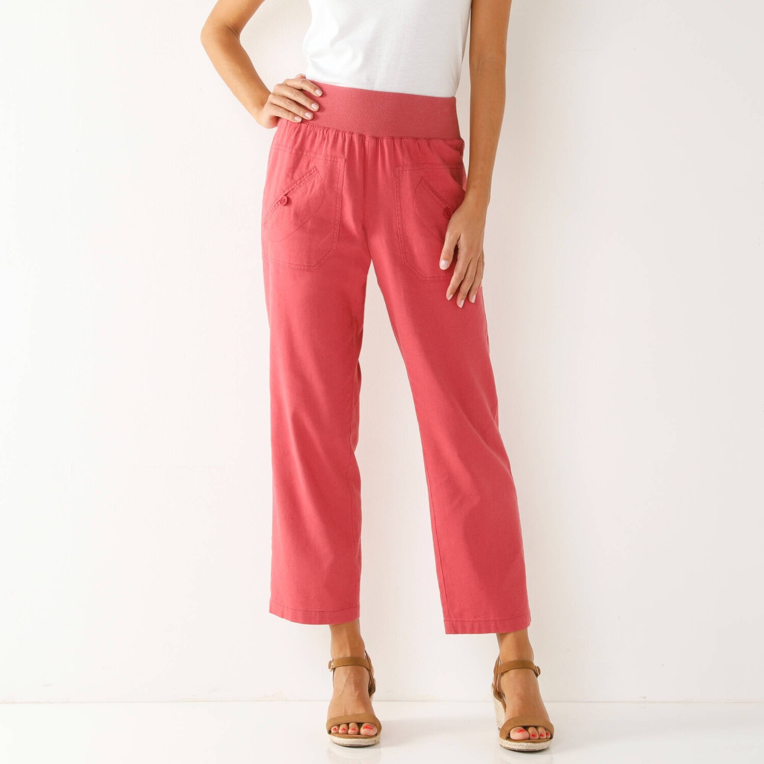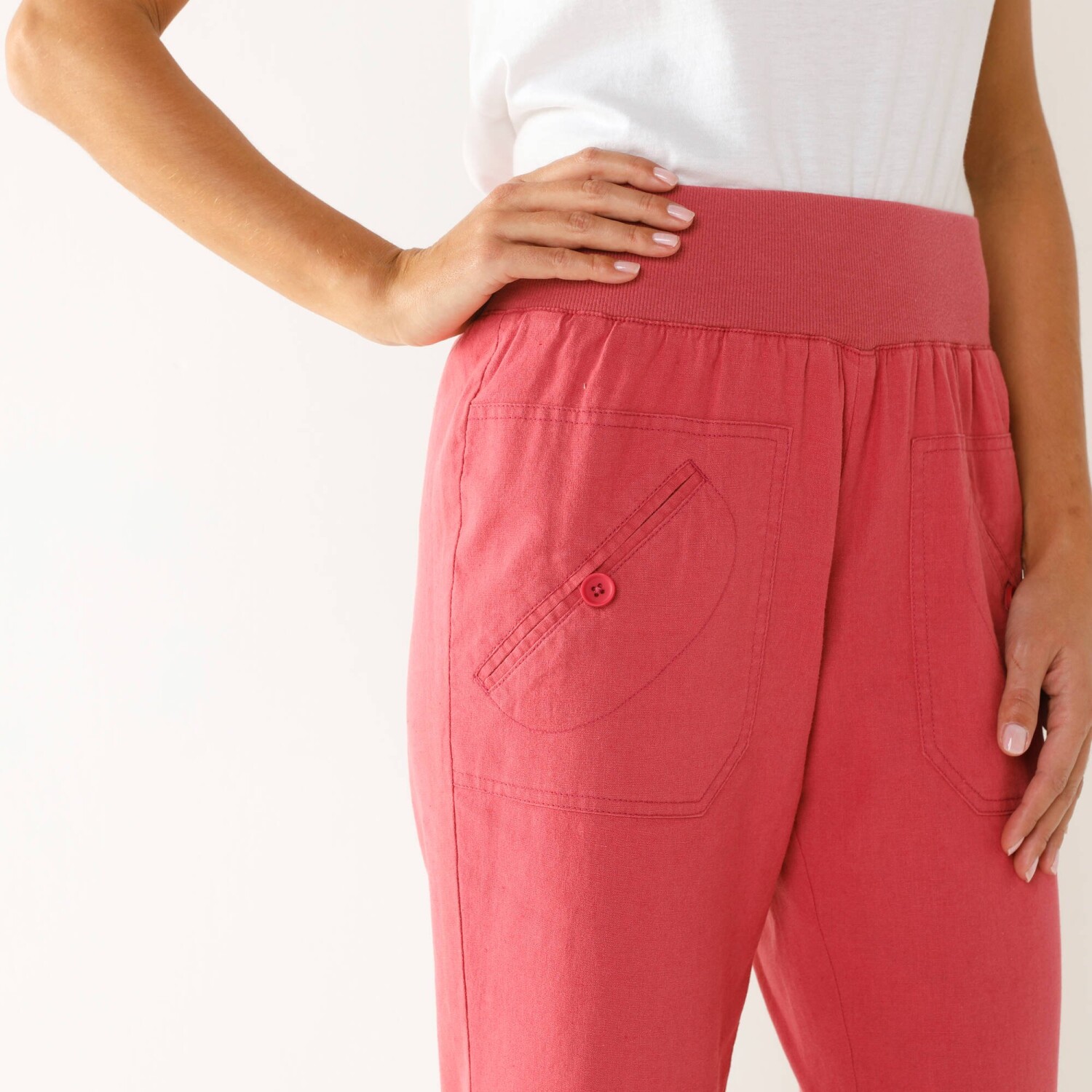 Długość 7/8 wie, jak optycznie wydłużyć sylwetkę. Spodnie o wąskim kroju są specjalnie zaprojektowane dla drobniejszej sylwetki. Normalna wysokość talii. Wąski krój 7/8 wydłużający sylwetkę. Wyprofilowana talia ze szlufkami. Zapięcie na suwak i guzik. 2 kieszenie z przodu. 2 kieszenie z przodu. Sznurki ściągające z tyłu. Spodnie wykończone plisą. Guziki. Można prać w pralce.