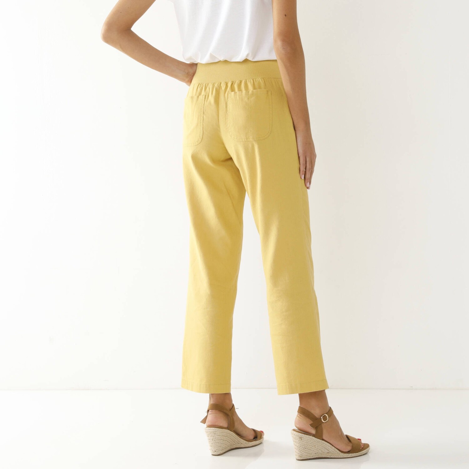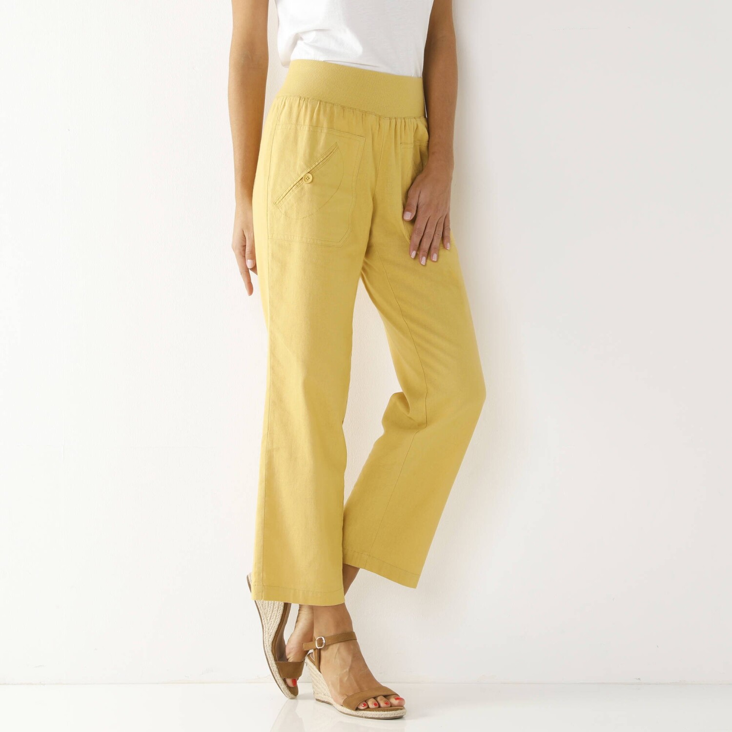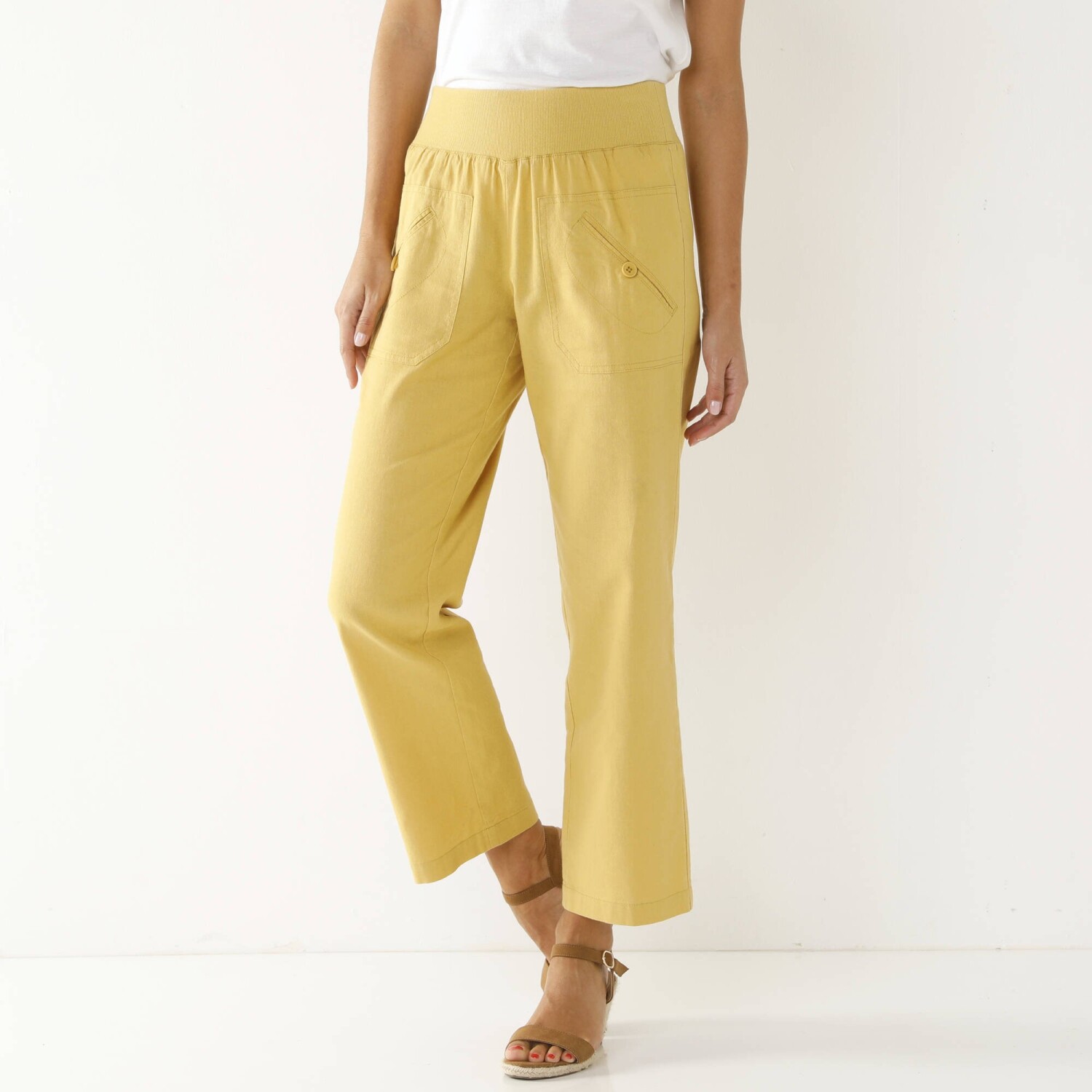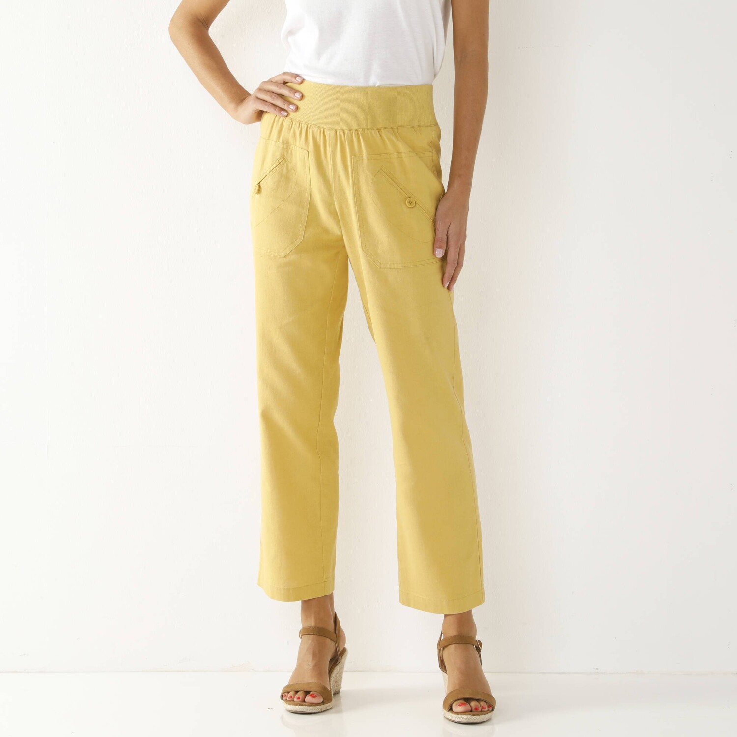 Nowoczesny krój, lekki, łatwy w pielęgnacji materiał i szeroka gama kolorów - oto spodnie 7/8 z elastyczną talią. Krój 7/8. Elastyczny, wygodny pas. 2 naszyte kieszenie z przodu z guzikiem i oczkami. 2 naszywane kieszenie z tyłu. Można prać w pralce.