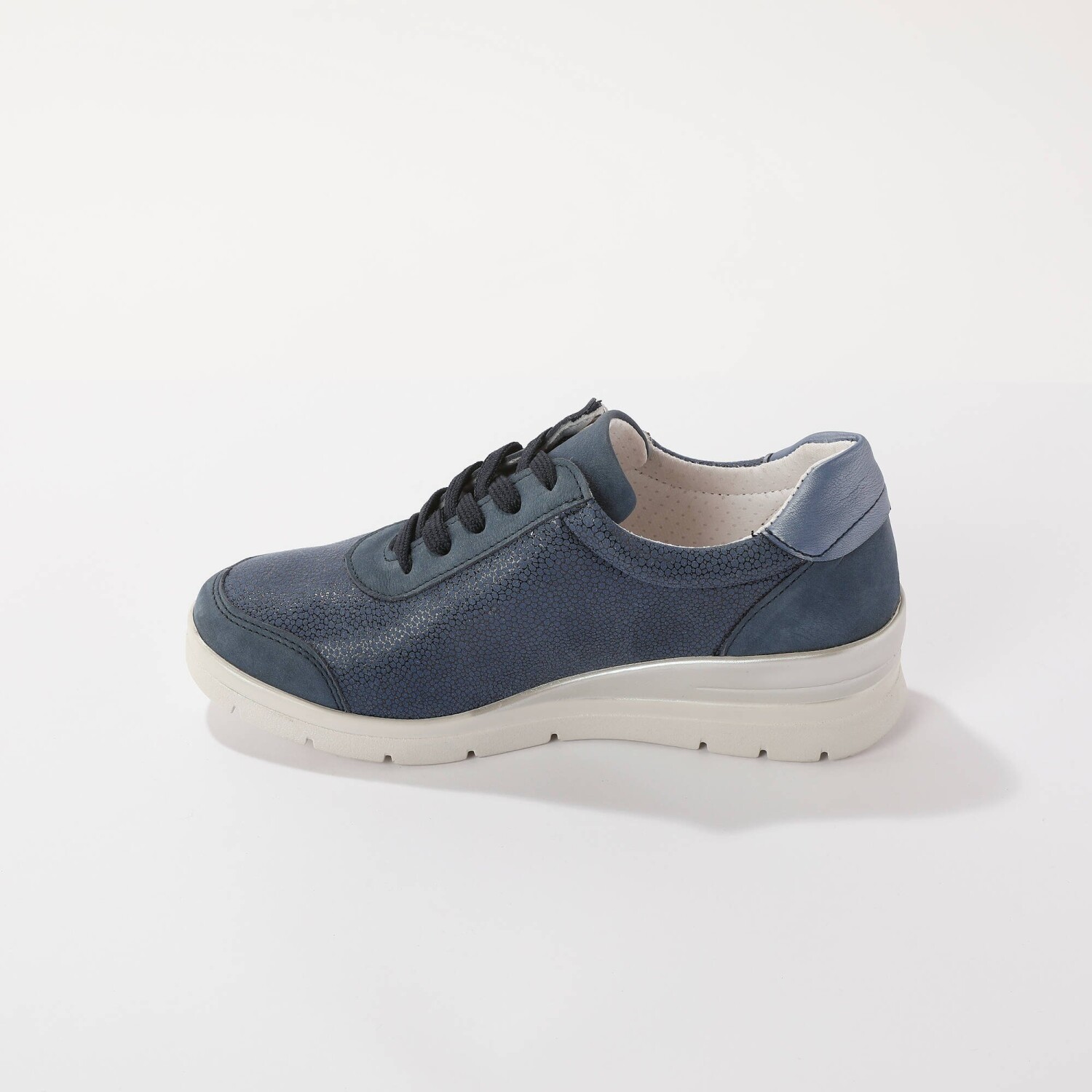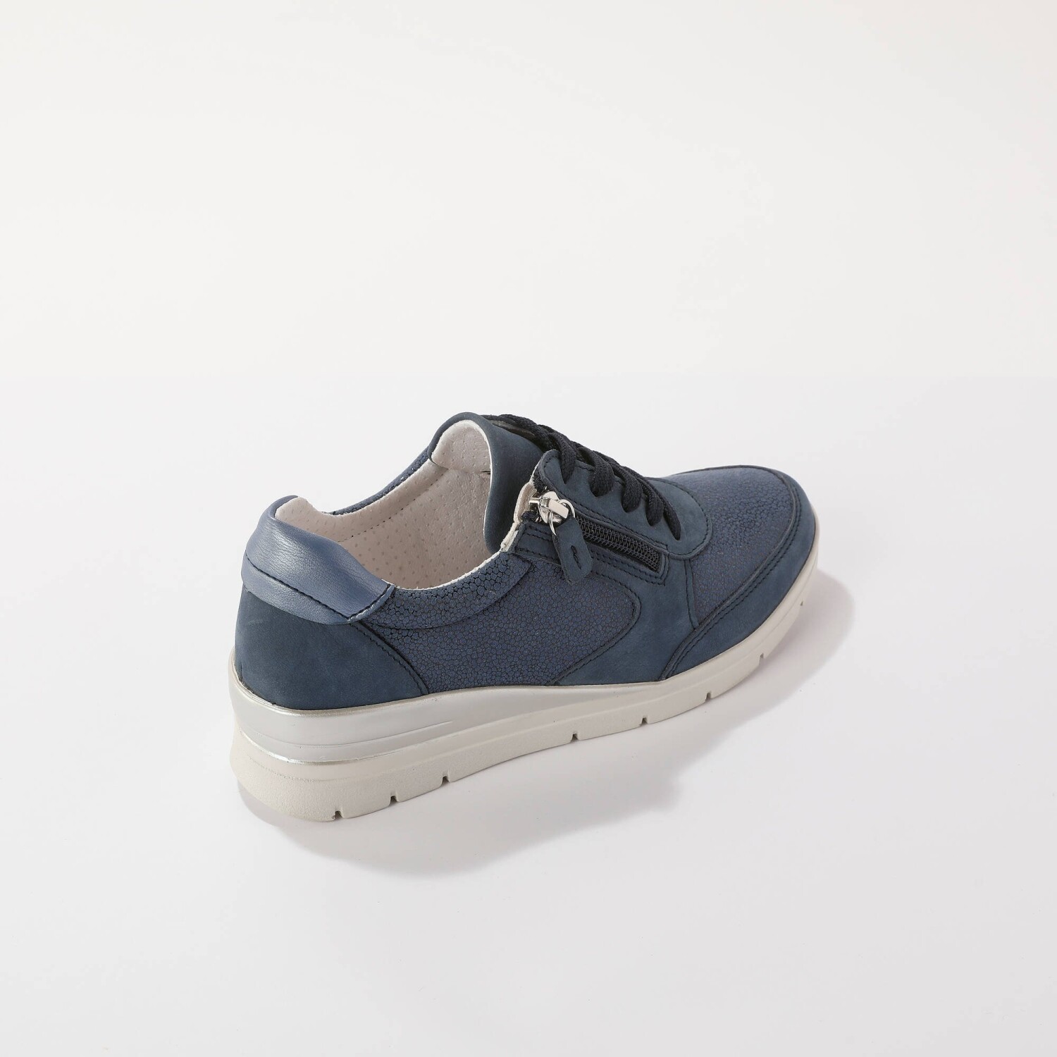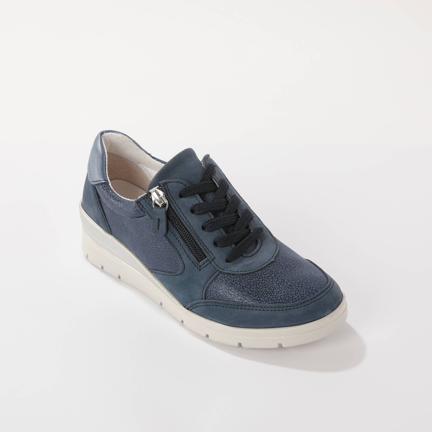 Skórzane trampki z elastycznymi wstawkami dodadzą Ci kilka centymetrów dzięki podeszwie na koturnie. Wygodna szerokość i elastyczne wstawki sprawią, że Twoje stopy będą w dotyku jak wata. Odpowiednie dla stóp wrażliwych i szerszych (o 10 mm więcej niż standardowa szerokość). Wykonane z naturalnej skóry. Błyszczące, elastyczne wstawki. Wyjmowana skórzana wkładka. Zamek błyskawiczny na zewnątrz. Płaskie sznurowadła z plastikowymi końcówkami. Miękka piankowa wyściółka wokół kostki. Koturn. Biała, antypoślizgowa podeszwa. Wyprodukowano w Portugalii.