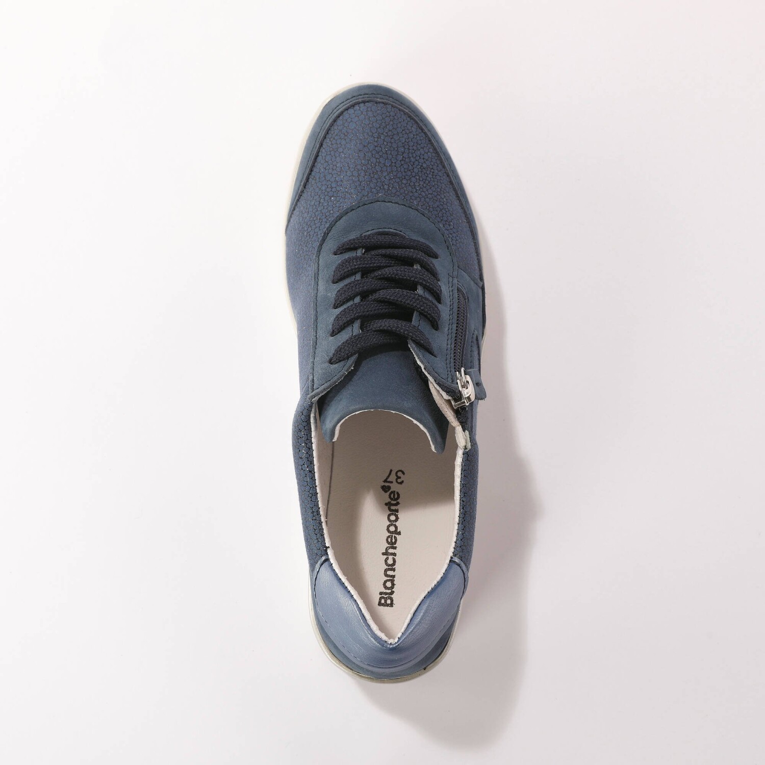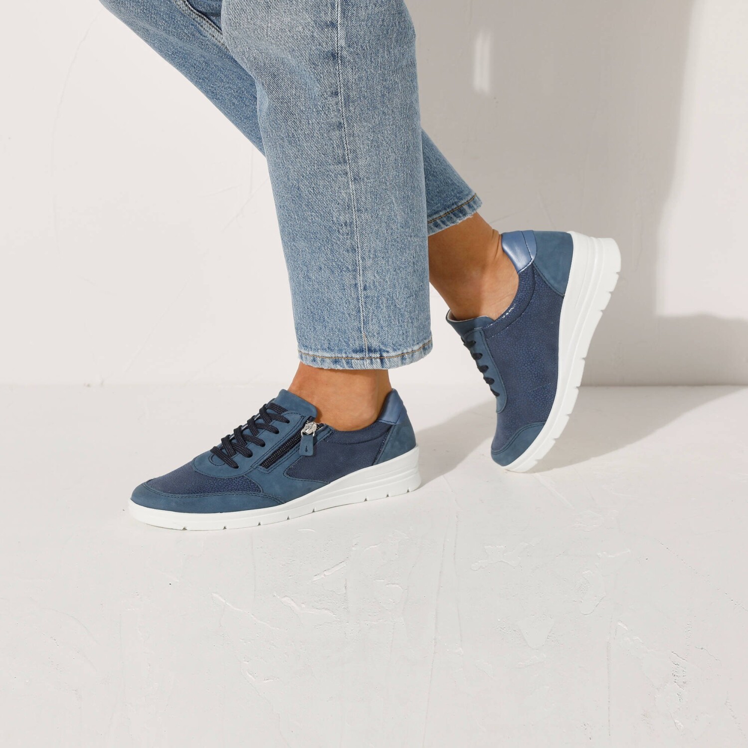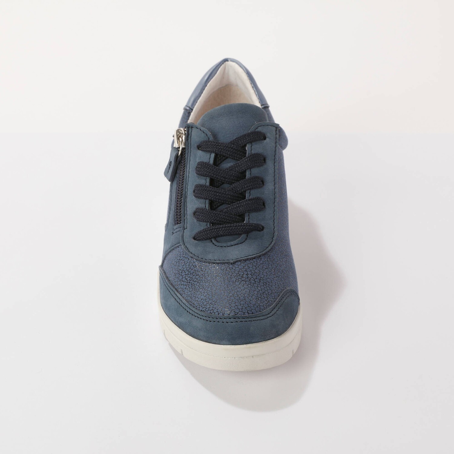 Skórzane trampki z elastycznymi wstawkami dodadzą Ci kilka centymetrów dzięki podeszwie na koturnie. Wygodna szerokość i elastyczne wstawki sprawią, że Twoje stopy będą w dotyku jak wata. Odpowiednie dla stóp wrażliwych i szerszych (o 10 mm więcej niż standardowa szerokość). Wykonane z naturalnej skóry. Błyszczące, elastyczne wstawki. Wyjmowana skórzana wkładka. Zamek błyskawiczny na zewnątrz. Płaskie sznurowadła z plastikowymi końcówkami. Miękka piankowa wyściółka wokół kostki. Koturn. Biała, antypoślizgowa podeszwa. Wyprodukowano w Portugalii.