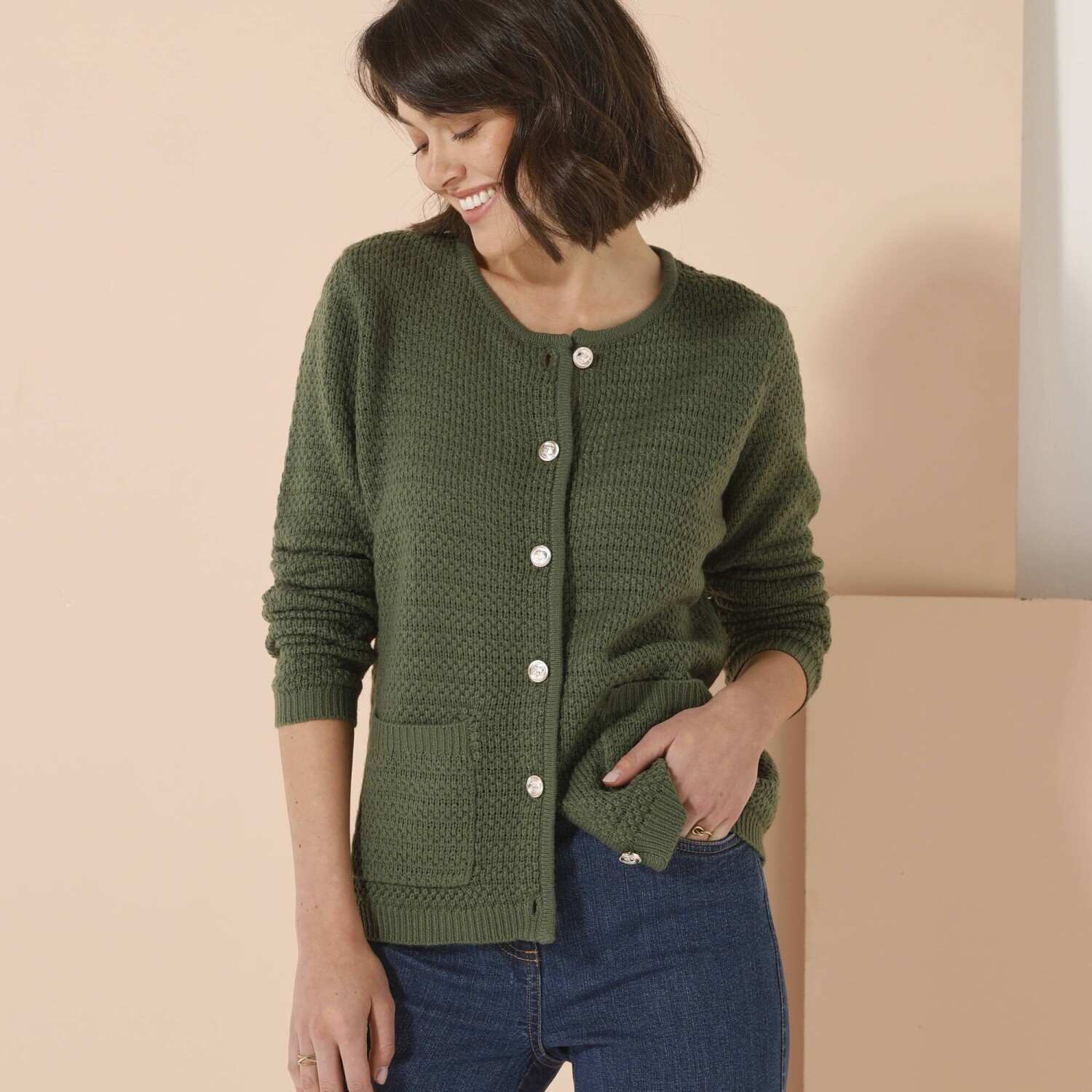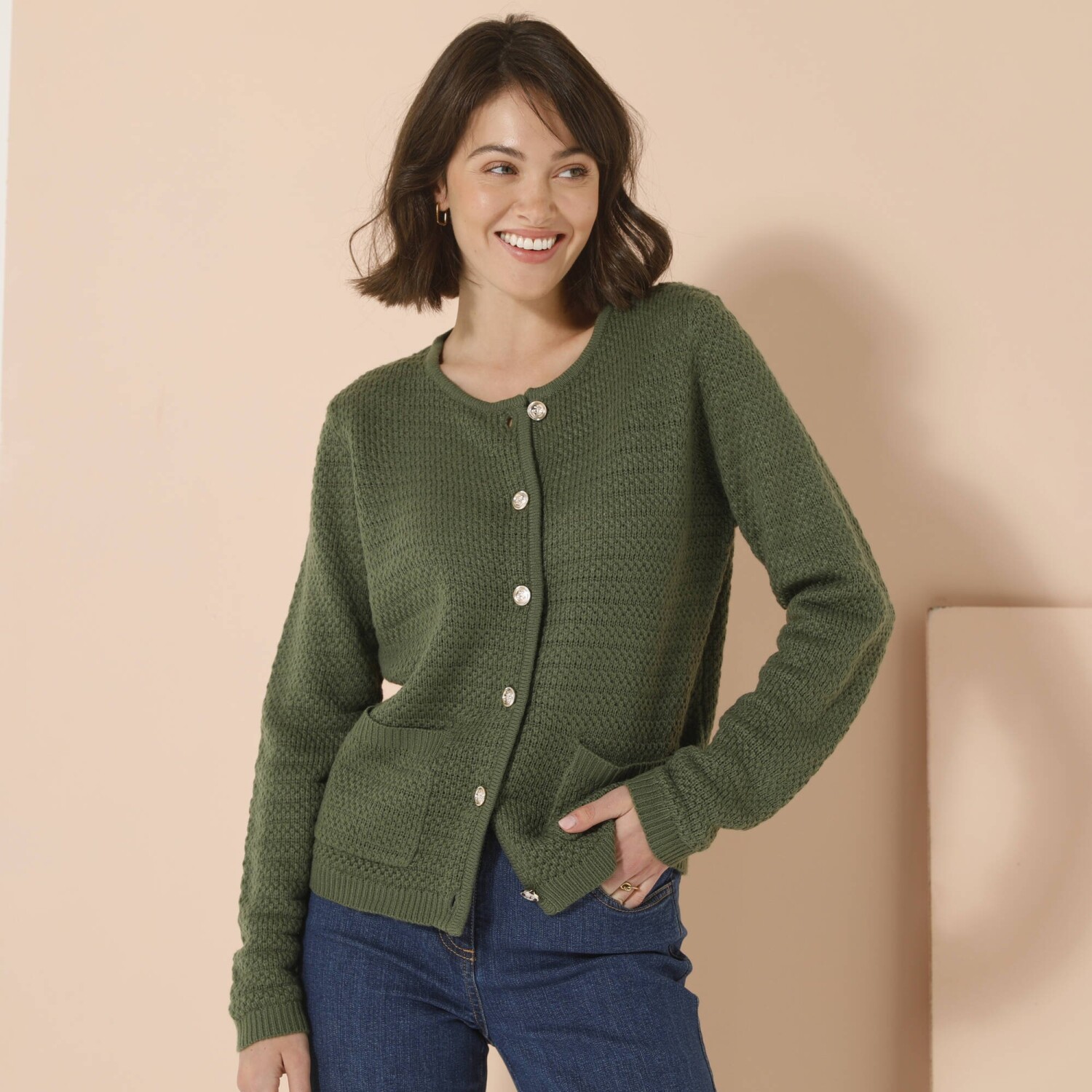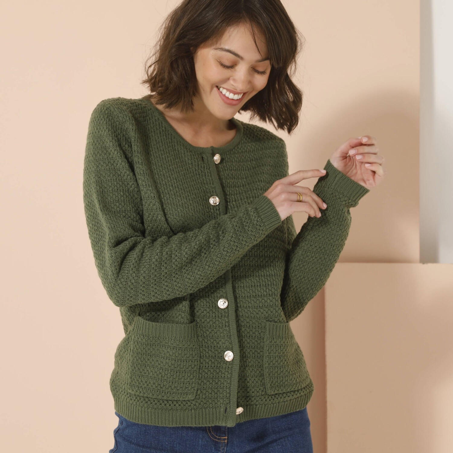 Elegancki sweter przypomina żakiet i jest ozdobiony złotymi guzikami. Świetny nie tylko do eleganckich spodni i bluzki koszulowej. Okrągły dekolt. Złote guziki z motywem kotwicy z przodu. 2 naszywane kieszenie z przodu. Długie rękawy. Prosty dół. Można prać w pralce.