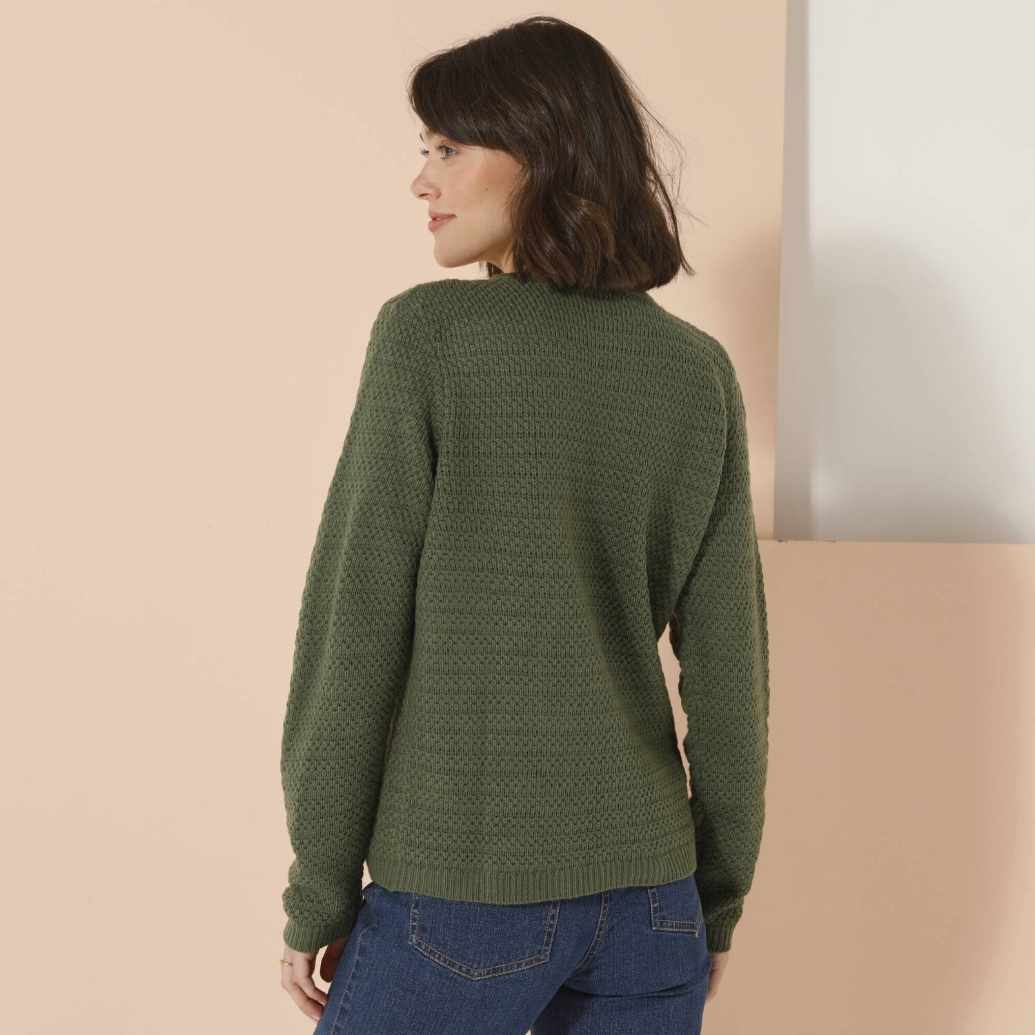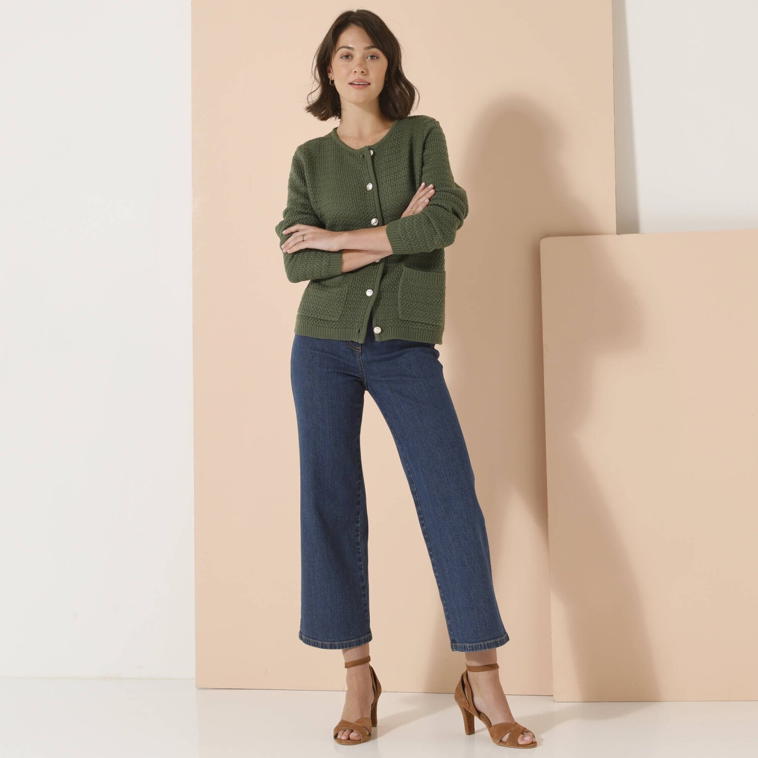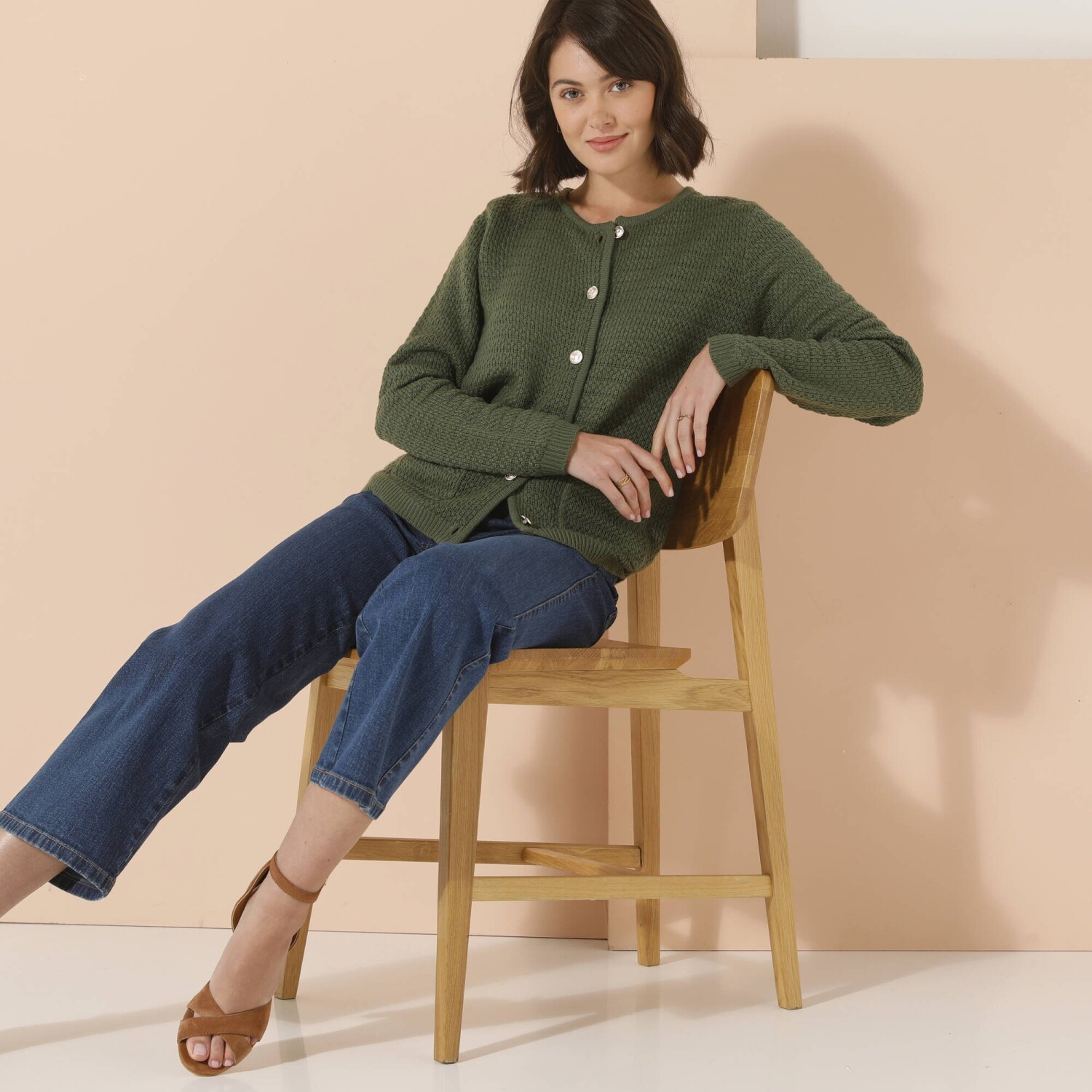 Elegancki sweter przypomina żakiet i jest ozdobiony złotymi guzikami. Świetny nie tylko do eleganckich spodni i bluzki koszulowej. Okrągły dekolt. Złote guziki z motywem kotwicy z przodu. 2 naszywane kieszenie z przodu. Długie rękawy. Prosty dół. Można prać w pralce.