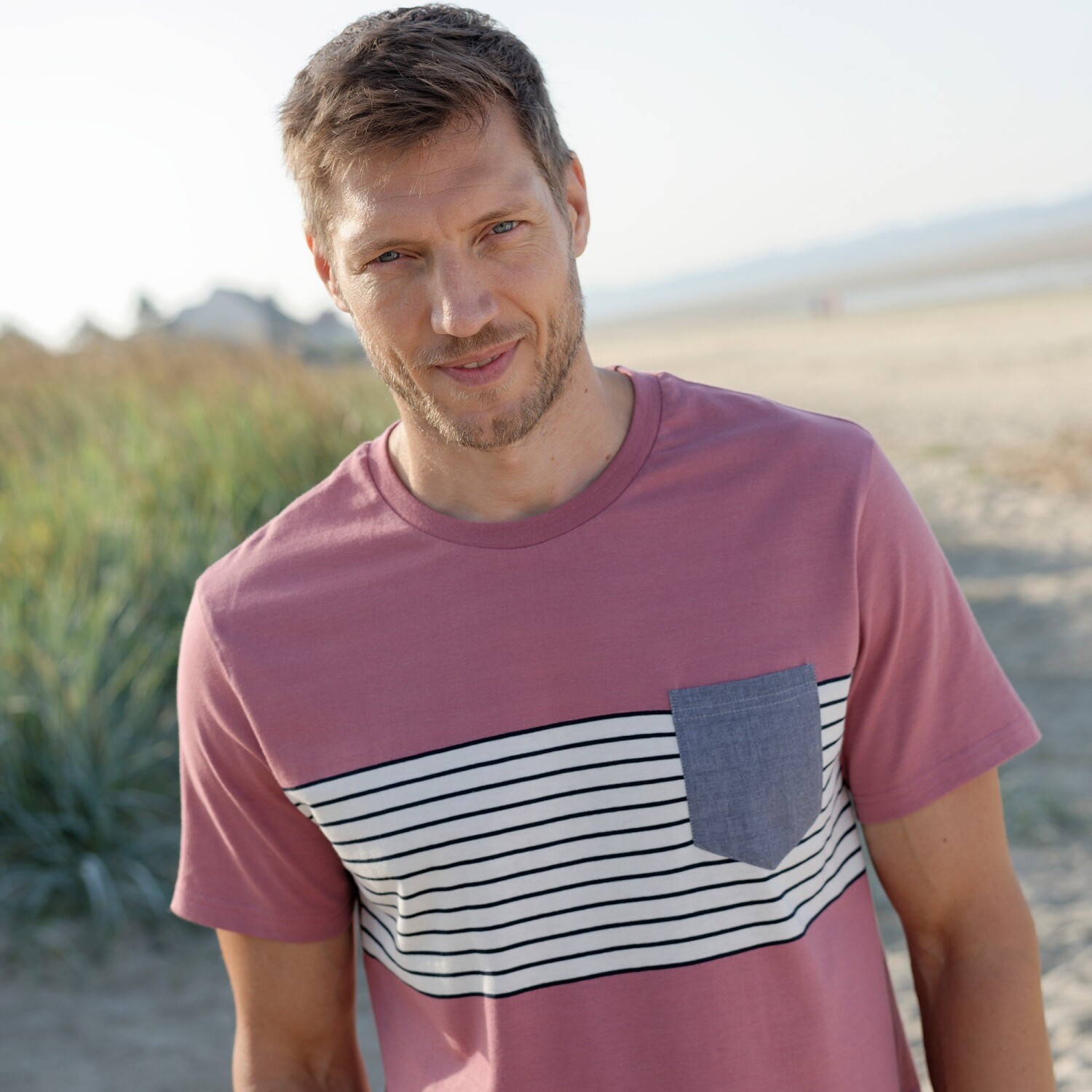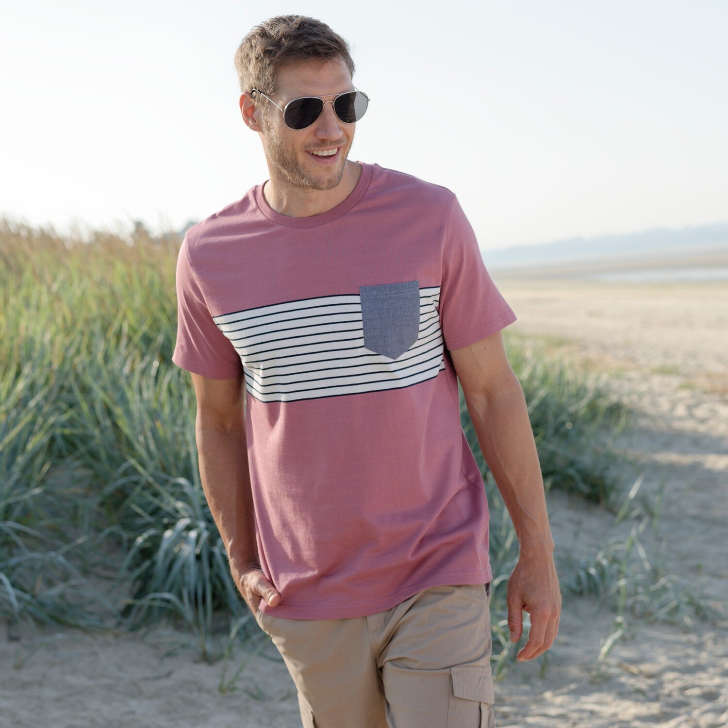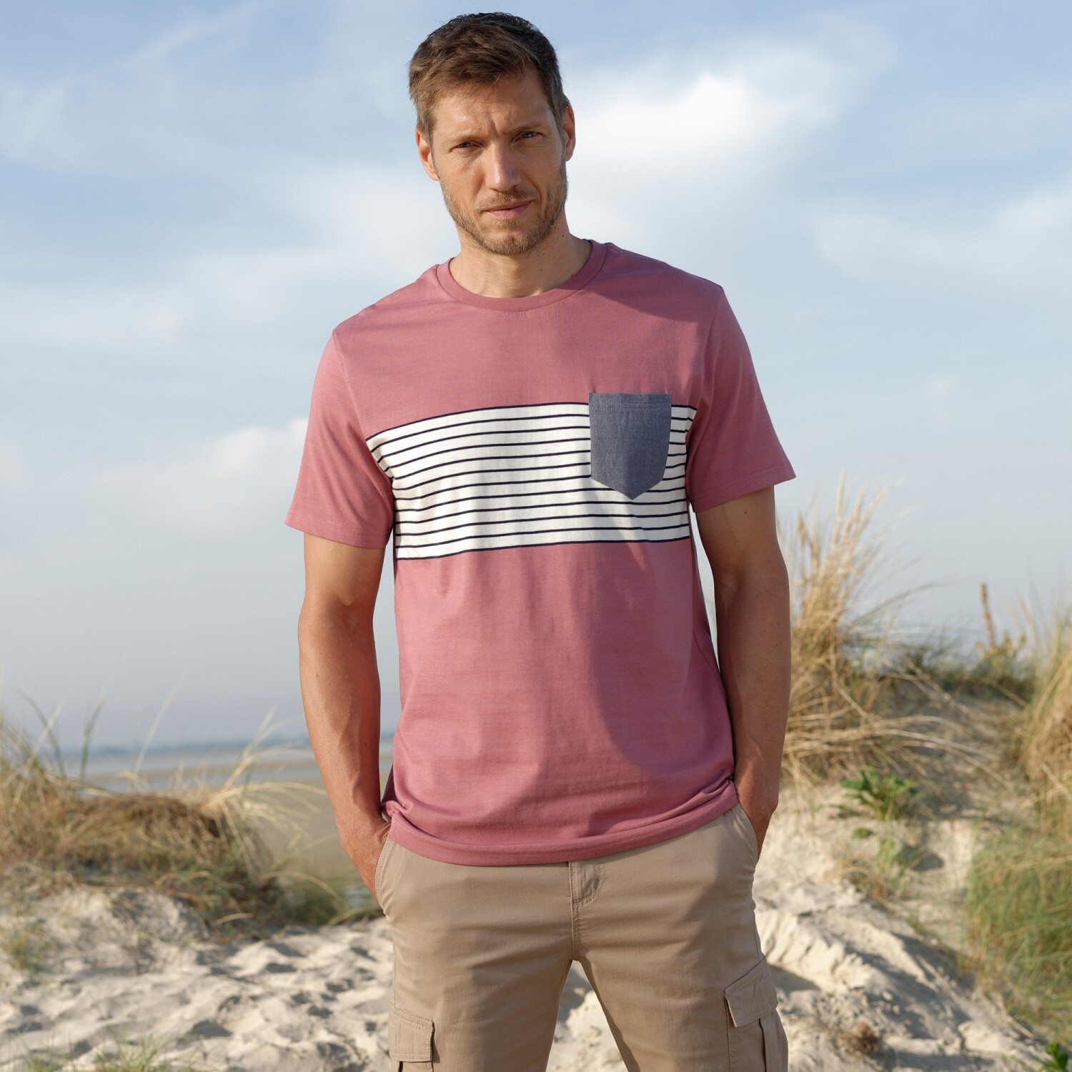 Klasyczna w kroju, oryginalna dzięki nadrukowi, nasza koszulka nadaje się na spacer na łonie natury lub w mieście. Okrągły dekolt. Krótkie rękawy. Przód z kontrastowymi centralnymi paskami z barwionego włókna. Kieszeń na piersi w kolorze chambray. Prosty dół. Można prać w pralce.