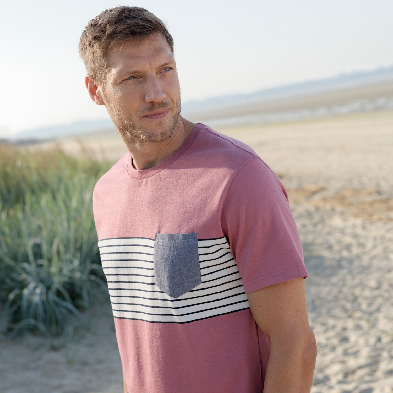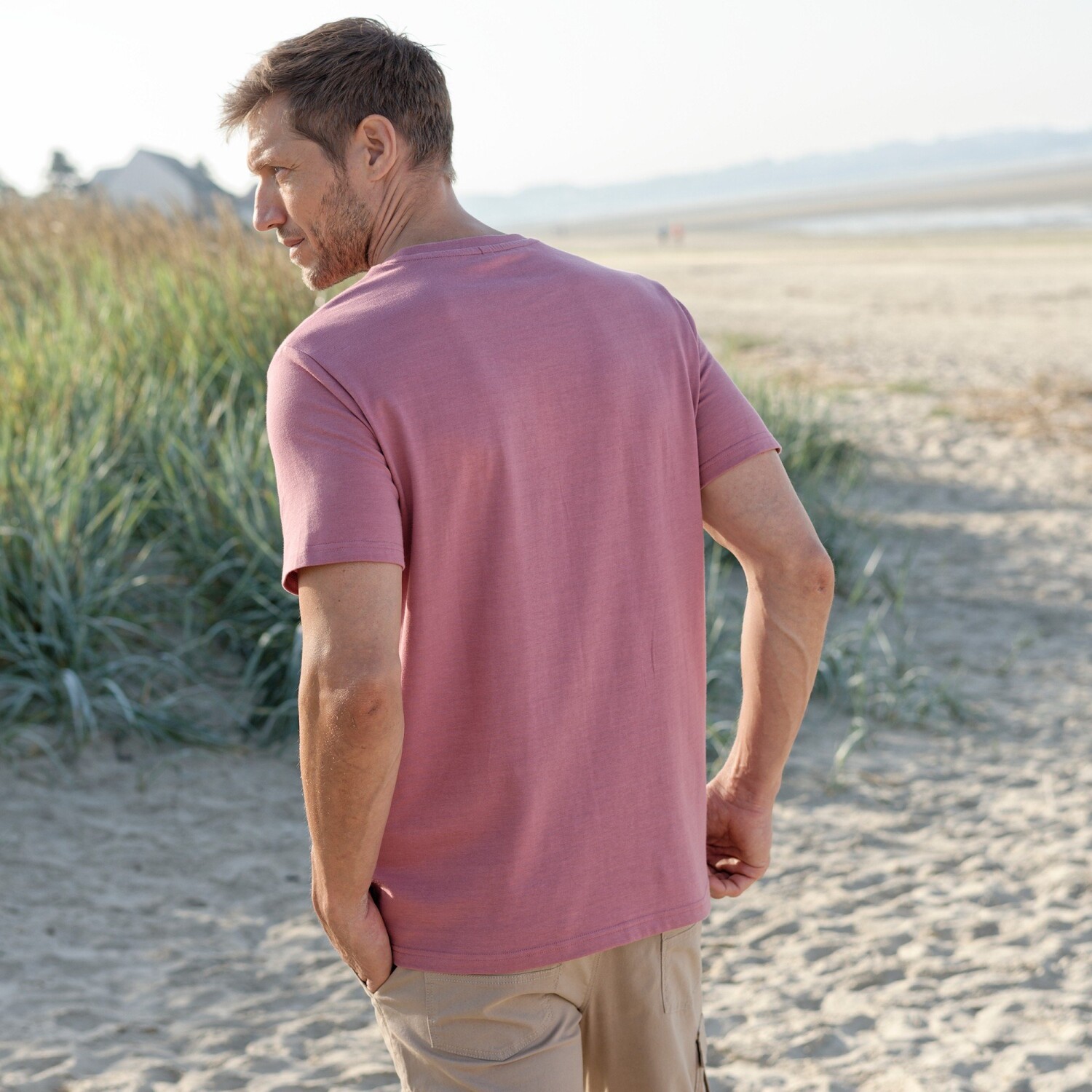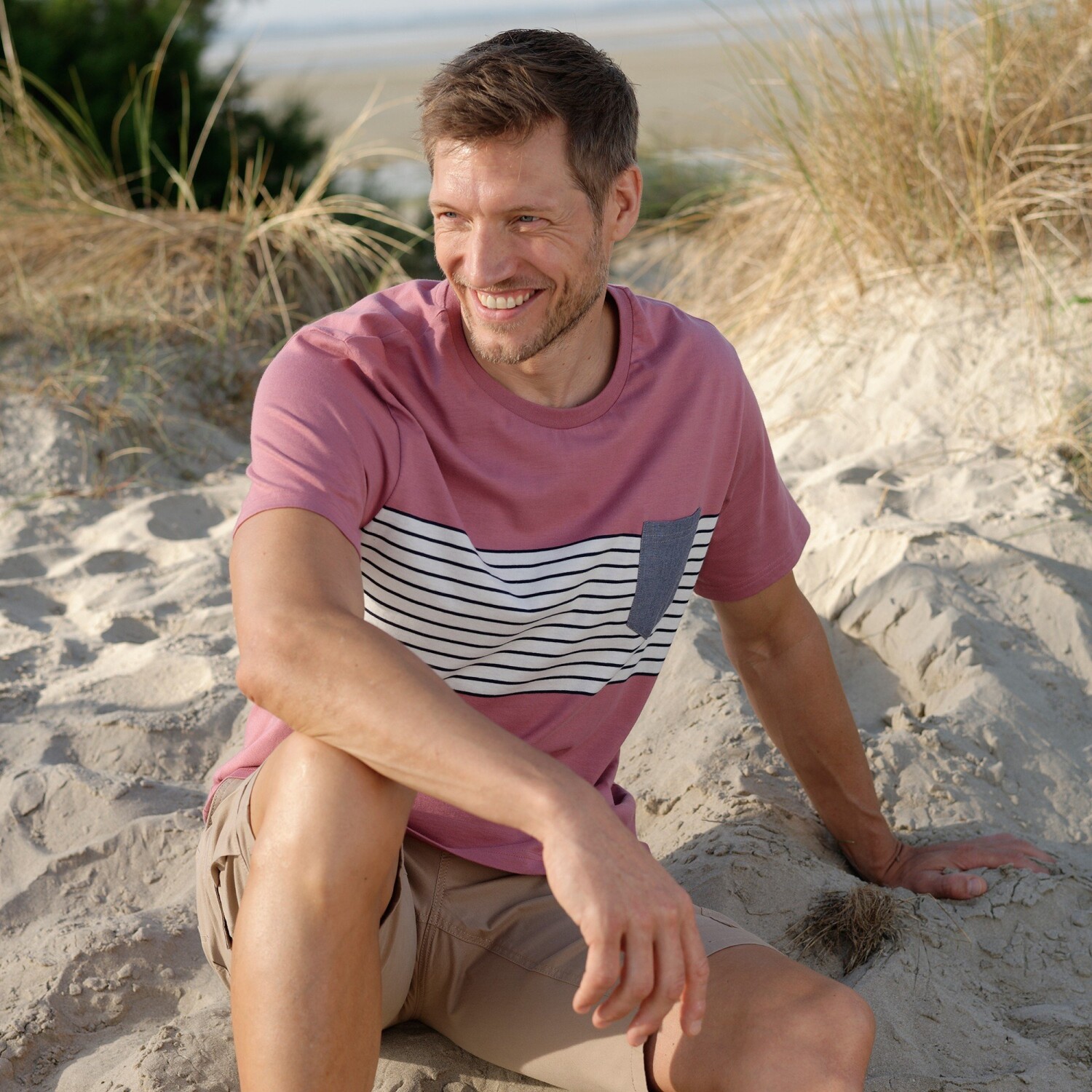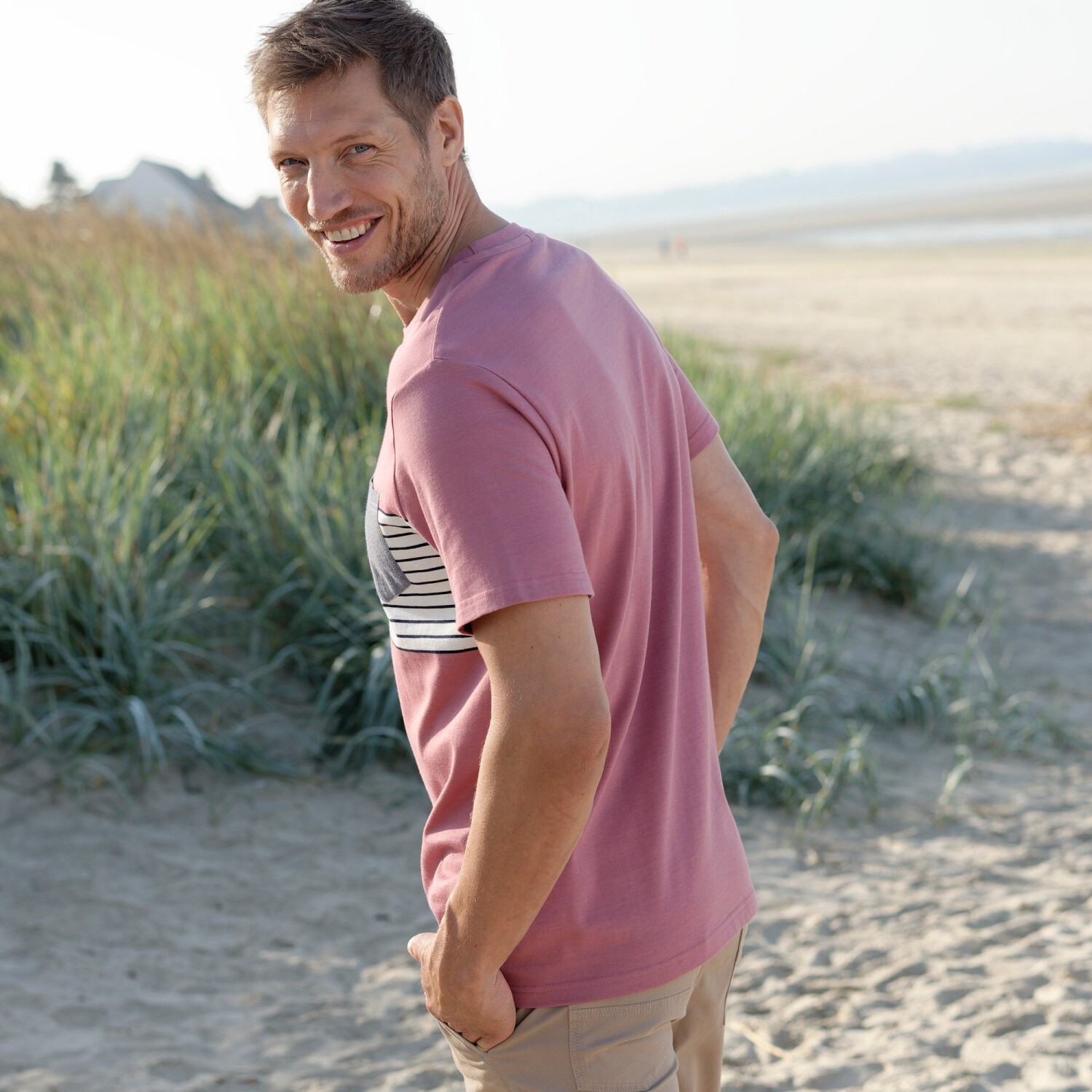 Klasyczna w kroju, oryginalna dzięki nadrukowi, nasza koszulka nadaje się na spacer na łonie natury lub w mieście. Okrągły dekolt. Krótkie rękawy. Przód z kontrastowymi centralnymi paskami z barwionego włókna. Kieszeń na piersi w kolorze chambray. Prosty dół. Można prać w pralce.