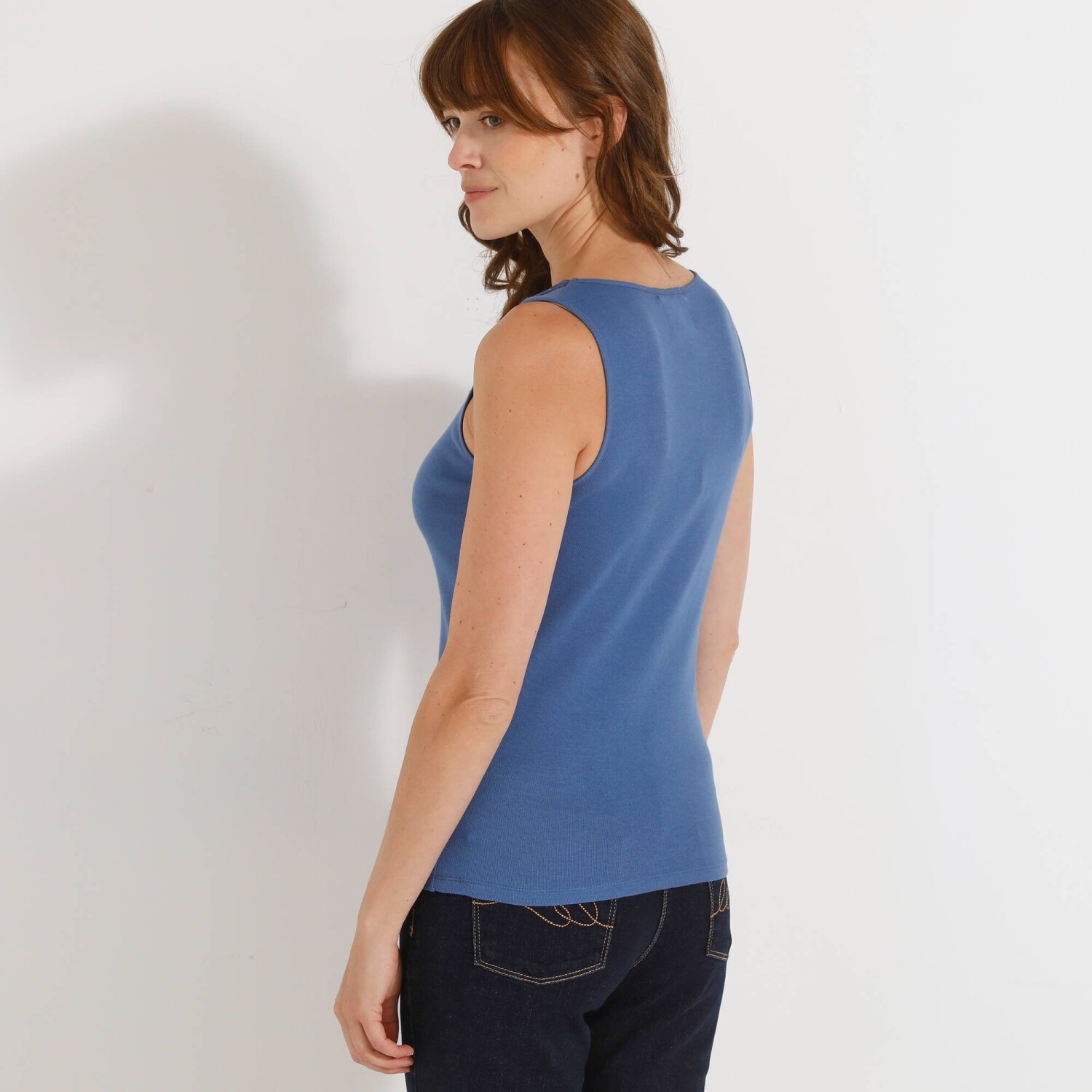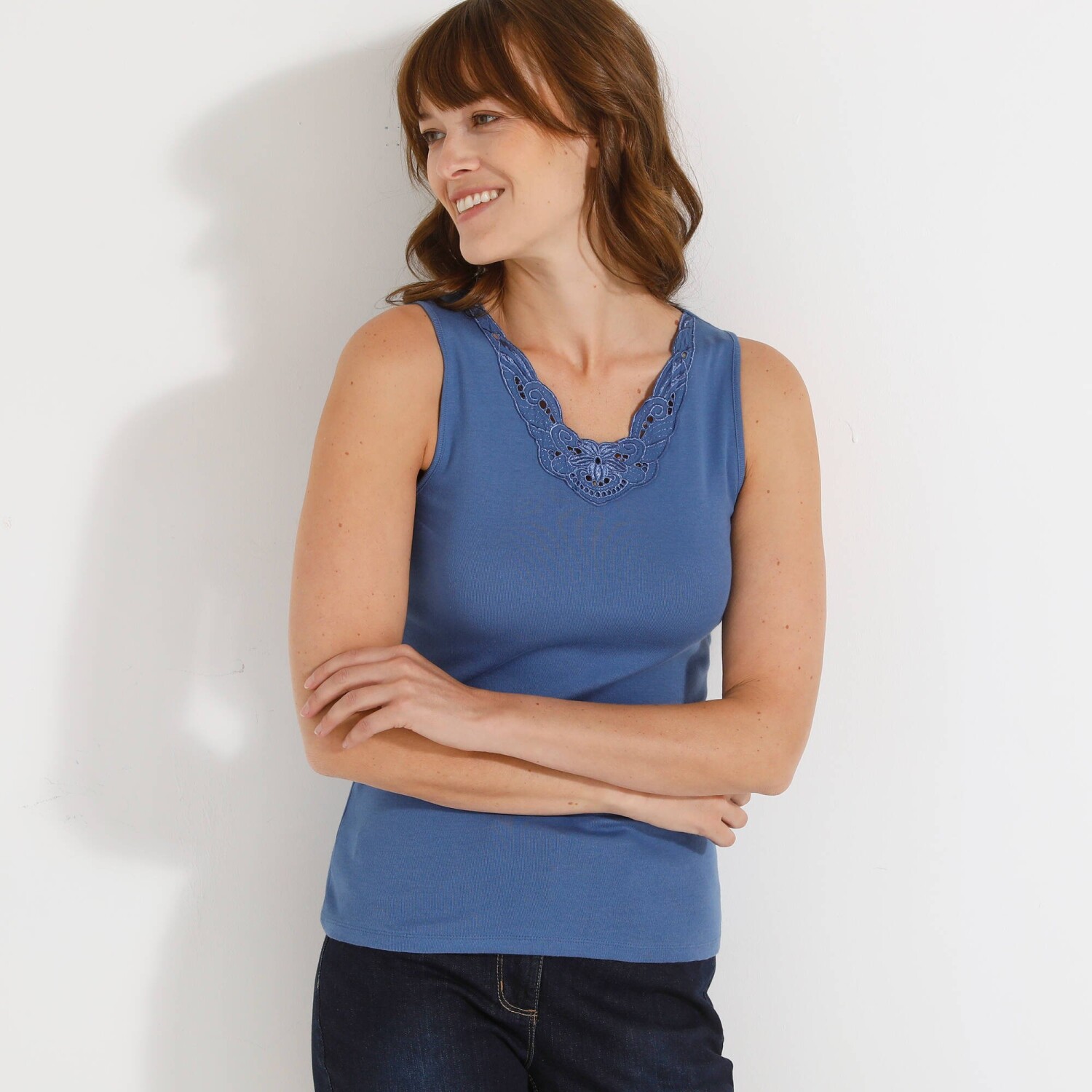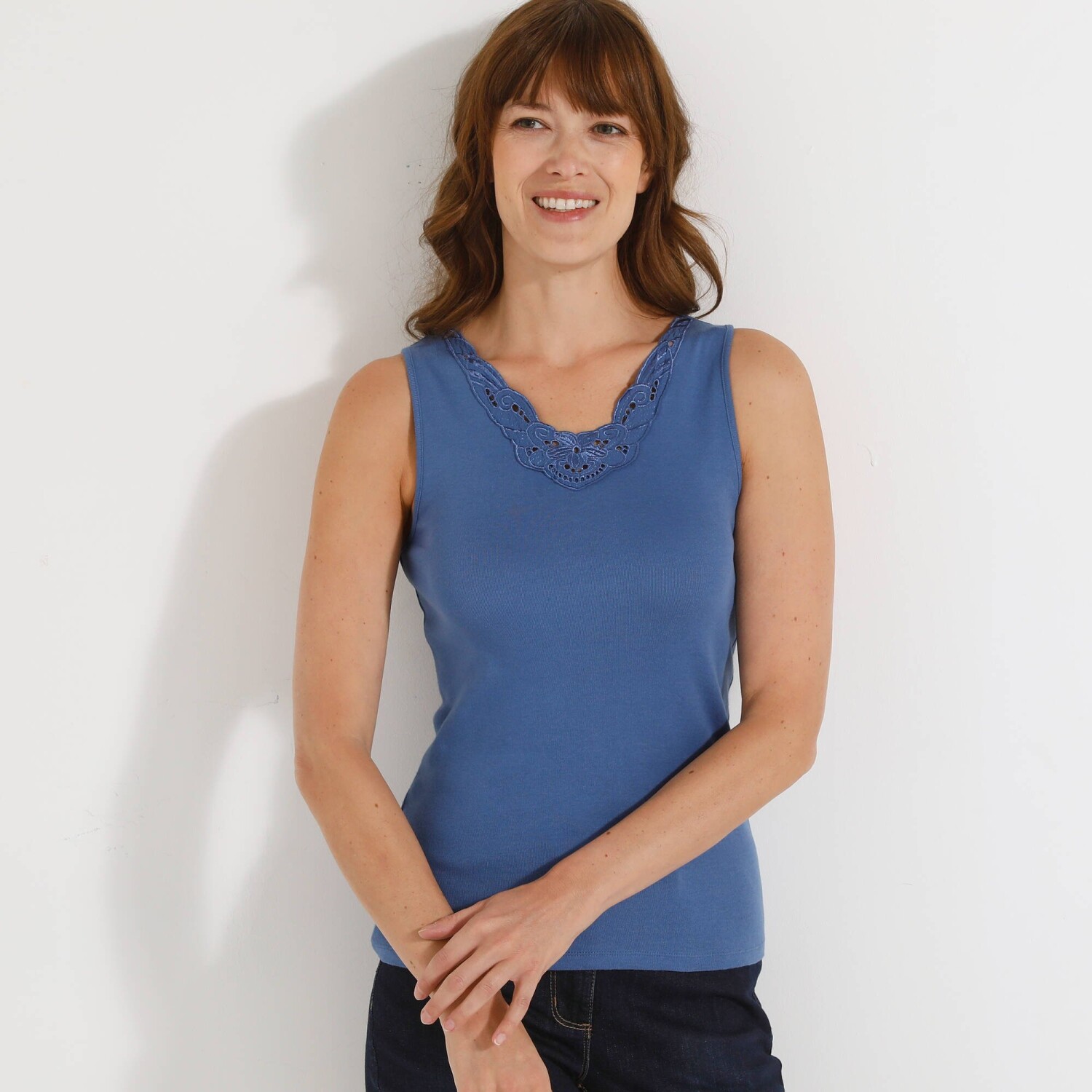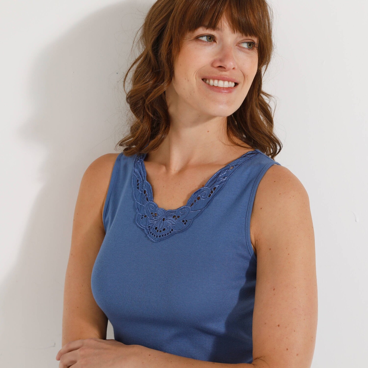 Bawełniany top z wyrafinowanym dekoltem obszytym koronką. Prążkowany materiał 1x1. Koronka przy dekolcie z przodu. Ładne wykończenie podwójnymi szwami. Można prać w pralce.