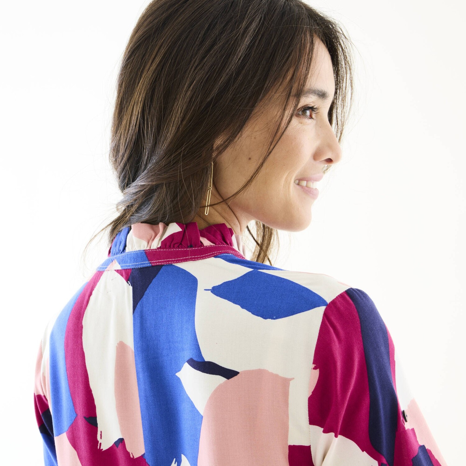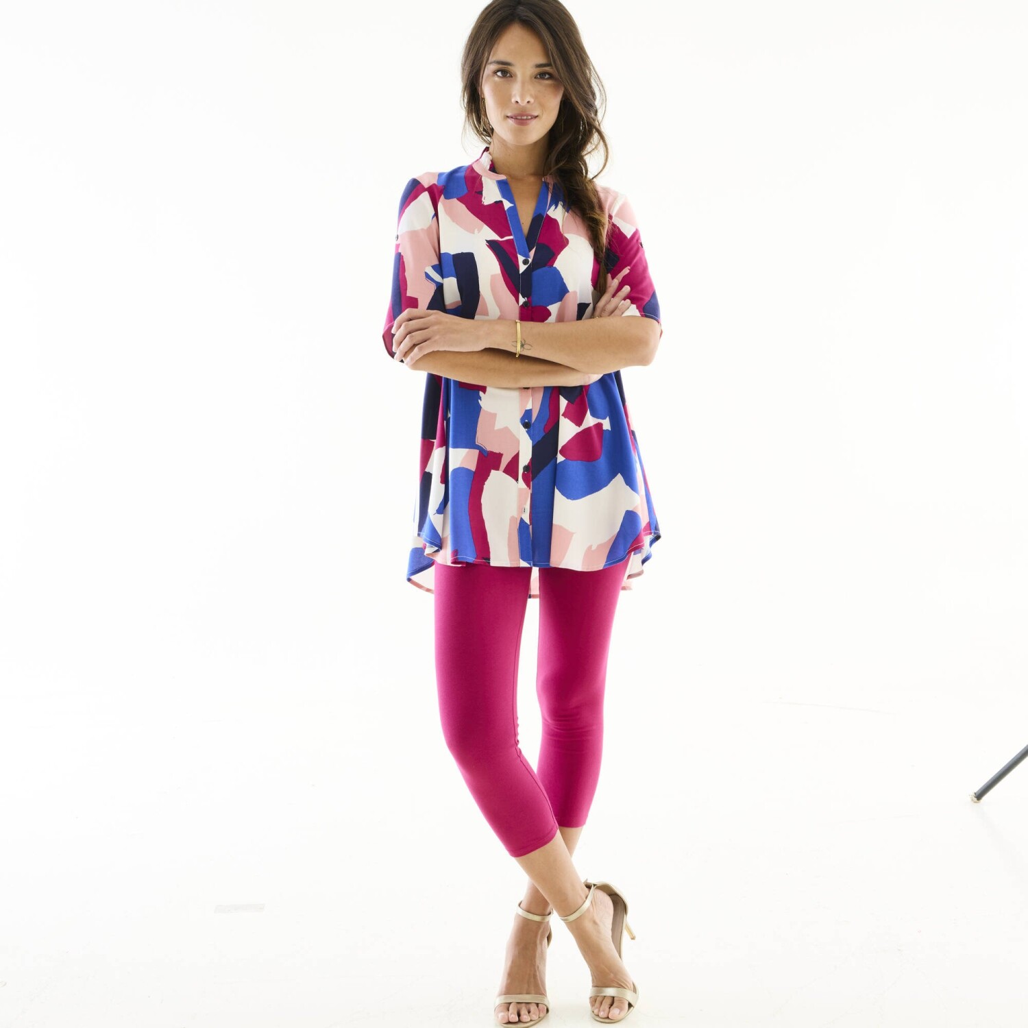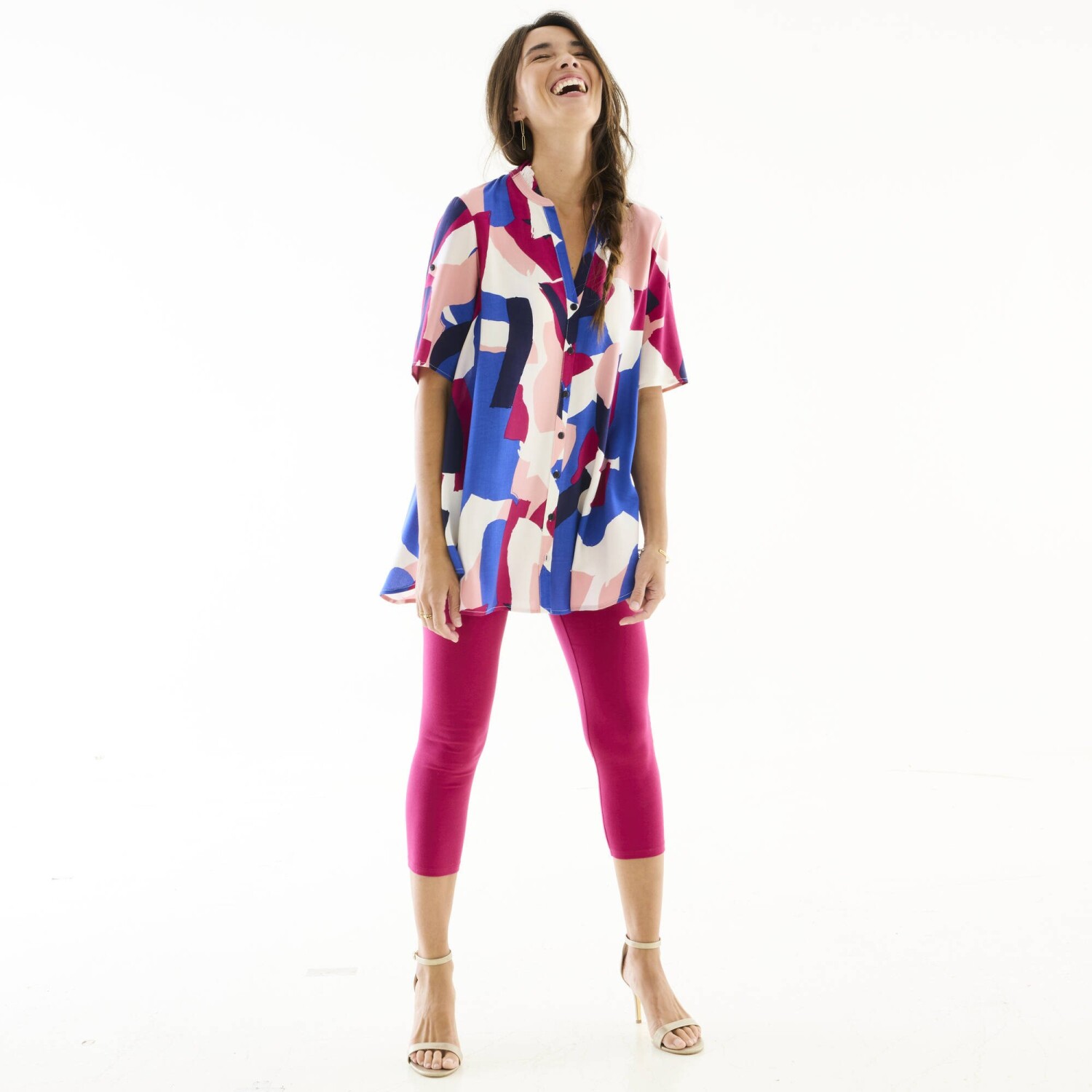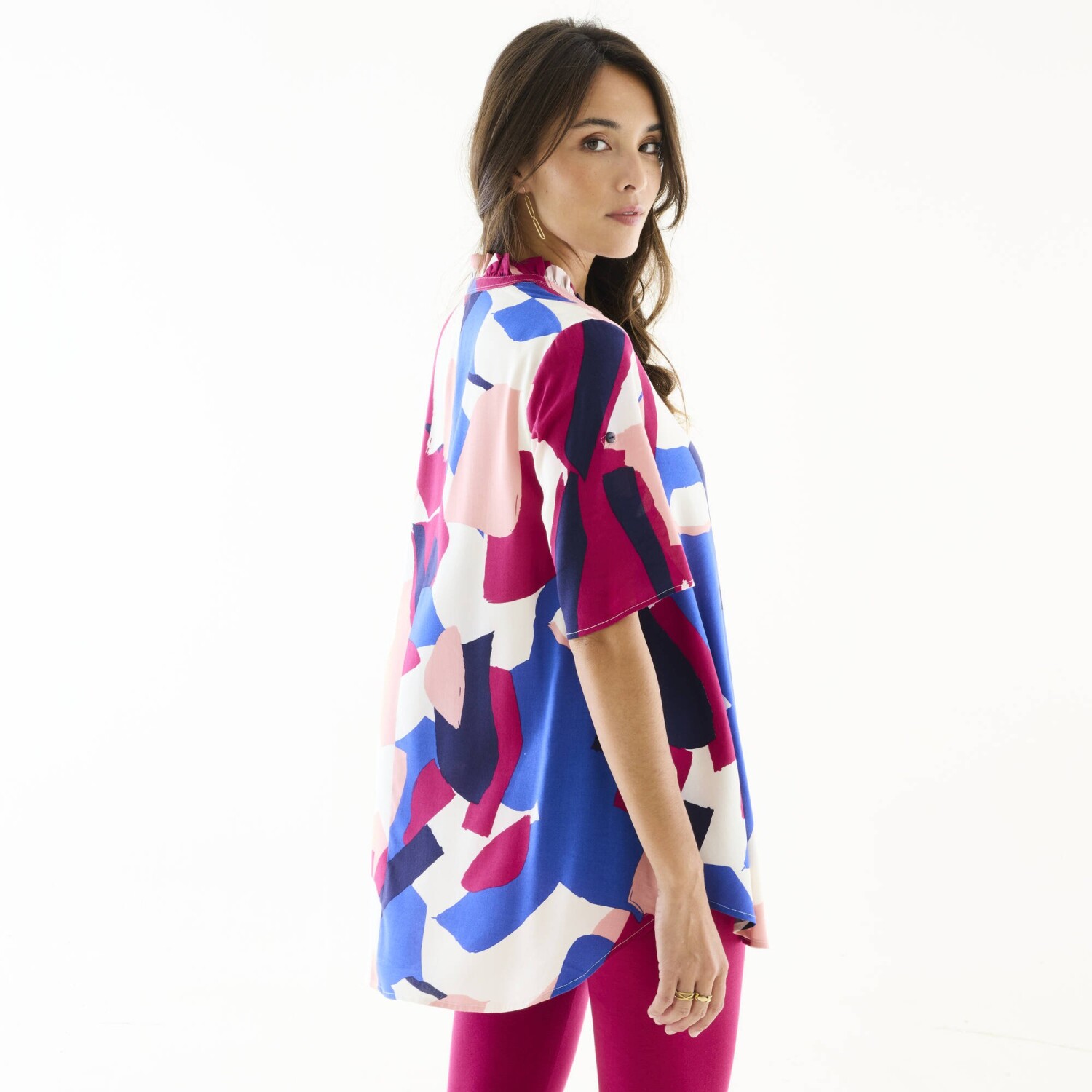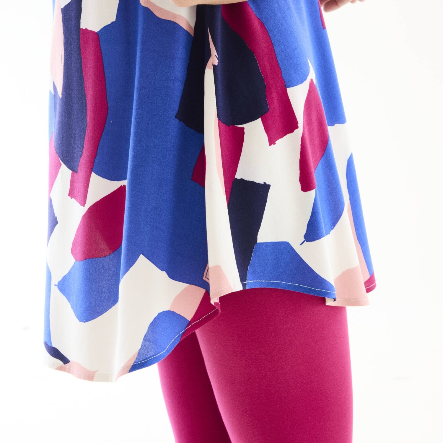 Wygoda, kobiecość i piękny nadruk! Długa tunika o rozkloszowanym kroju świetnie komponuje się z kolorowymi legginsami. Kolorowy graficzny wzór w artystycznym stylu sprawia, że nie można jej przeoczyć. Tunezyjski dekolt z falbaną. Pełny przód. Rękawy do łokcia z zapięciem na guziki. Rozkloszowany dół. Można prać w pralce.